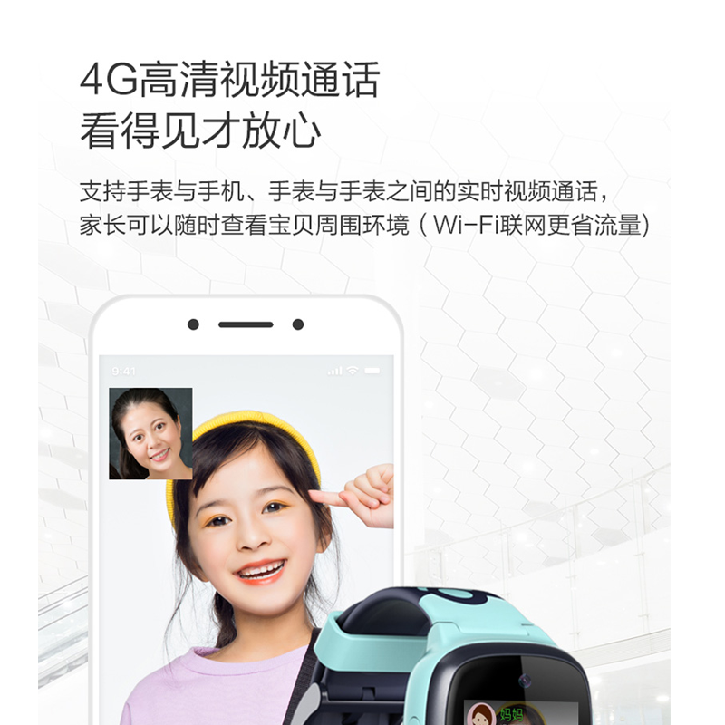 360 9X 儿童电话手表采用1.4英寸高清炫彩触屏,外表使用2.5D康宁大猩猩玻璃屏保护,食品级双色硅胶表带,佩戴安全舒适,升级20米防水,可在泳池佩戴。9X 儿童电话手表支持全网通4G网络,支持VoLTE高清通话,配以200万像素摄像头,支持视频通话。安全方面,9X 儿童电话手表支持室内定位、实时追踪手表位置、可轨迹记录、设置安全区域、一键SOS、上禁用等功能;可设置支付宝扫码功能、支持手表QQ,支持少儿中英词典查询;同样也支持计步、碰碰交友等社交功能。