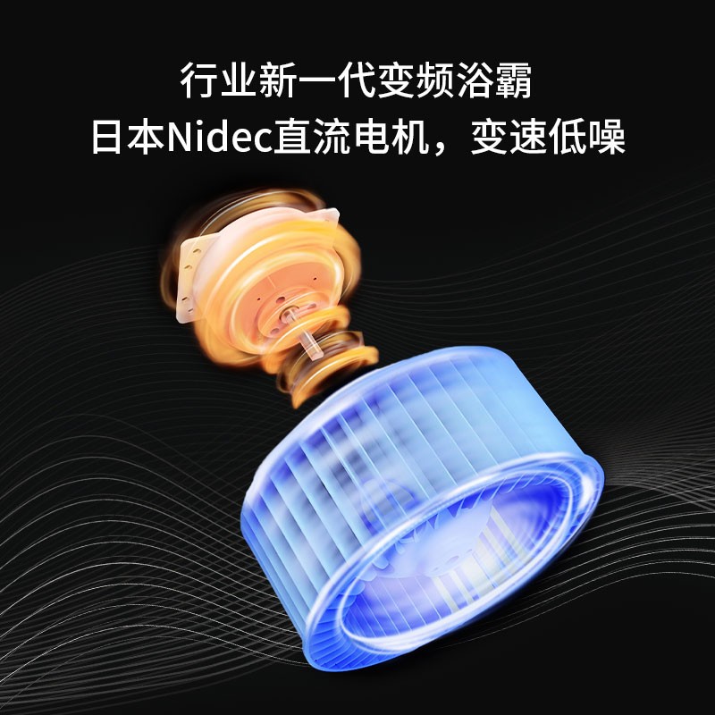 此款采用日本Nidec直流电机,变速低噪,功能无极变速,自然柔风吹拂,低音换气,远超传统交流电机,电能转化效率高,动力强劲运行安稳,节能环保,2800w大功率制热,1min升温速热,PTC模块,间距排布,热气涌流不干扰,暖意直达浴室不衰减,360°四面环吸进风,热流高效巡航隐藏侧进风风道,相比传统正面进风口,进风风量更大,175mm大风道螺旋设计,大口径高速风轮,配合阿基米德螺旋风道设计,风阻小,暖风有效巡航,橫向送风,风轮越大,风道越精细,加热速率加倍。
