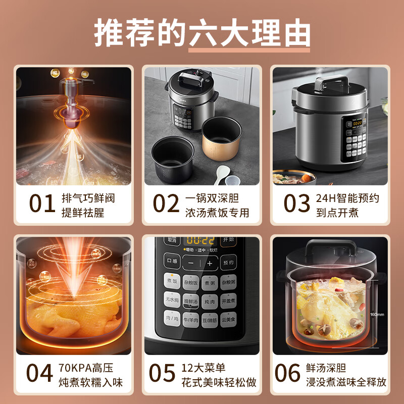 美的这款型号为MY-E522 电压力锅,5L大容量,满足1-10人使用需求。加深内胆,深胆加深15%,比普通内胆高出约20mm。触控大屏面板,清晰明了老人也会用。一锅多用,焖炖煲煮样样都行,搭配去腥提鲜技术,汤浓味更鲜。70kPa高压大幅提升鲜味,配有多样烹饪功能(特色无水焗功能:利用食材本身水分进行烹饪,轻松在家复刻网红食物;开盖煮功能:开盖直接收汁,无需换锅,开盖变身火锅,一锅多用;免泡杂粮饭功能),一锅双胆,专胆专用,饭菜不串味,叠放双胆,24H智能预约,海量云食谱,14重安全保护。