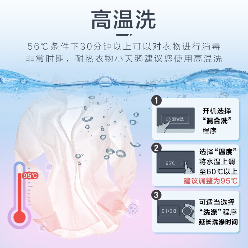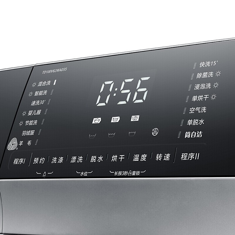 小天鹅TG100V62ADS5 滚筒洗衣机拥有10公斤洗涤容量,全屏触控式操作,采用BLDC变频电机,脱水转速达1400转/分钟。此款最大的特色在于具有银离子杀菌和立体防菌技术,筒内的银离子发生装置可在与水流接触过程中释放银离子,深入纤维消除细菌,净衣抑菌,支持95度高温洗涤,雾态喷淋洗涤,减少泡沫残留。产品共有14种洗涤程序,支持15分钟快洗、除菌洗、混合洗、羽绒服等,并支持预约,带有童锁保护。洗净比,1.05,一级能效认证,外观尺寸为(深×宽×高):595*560*850mm。