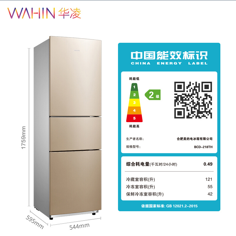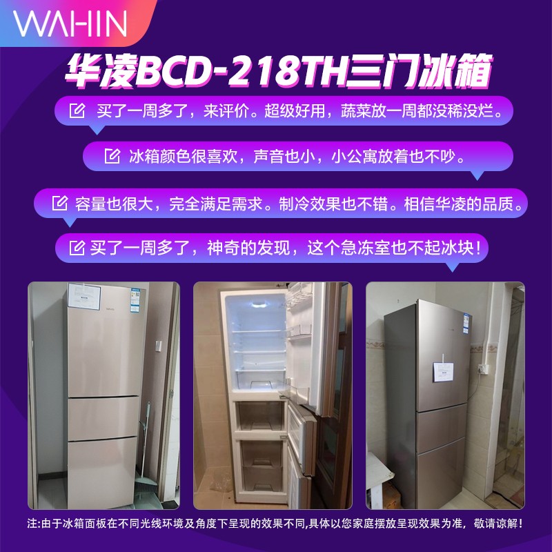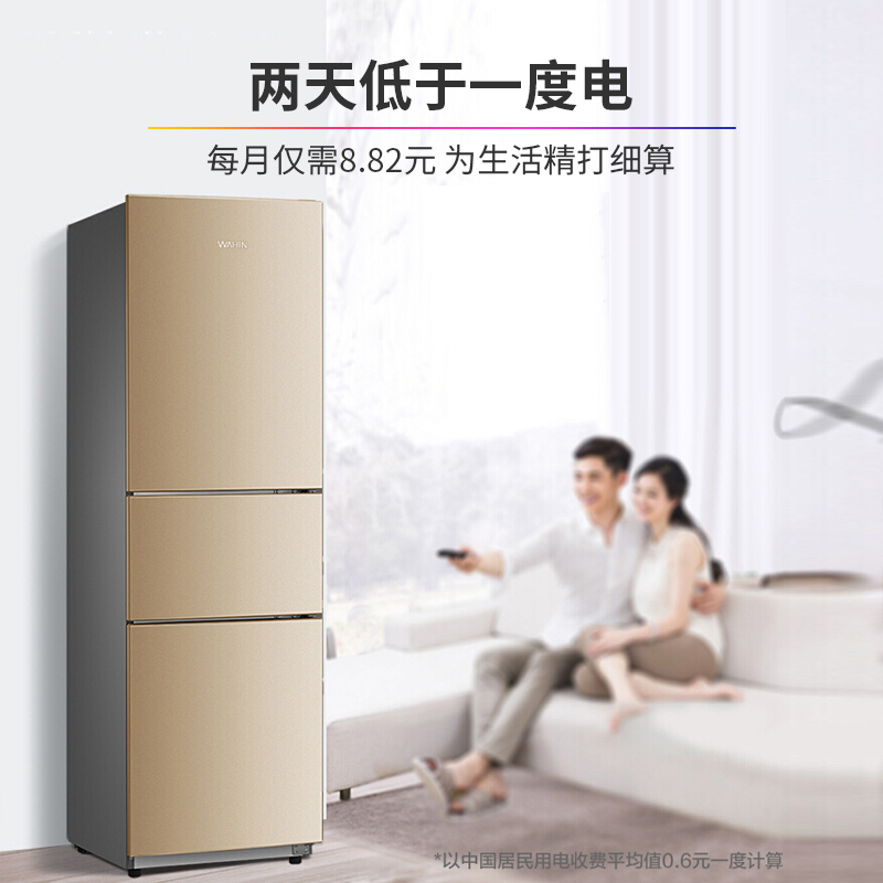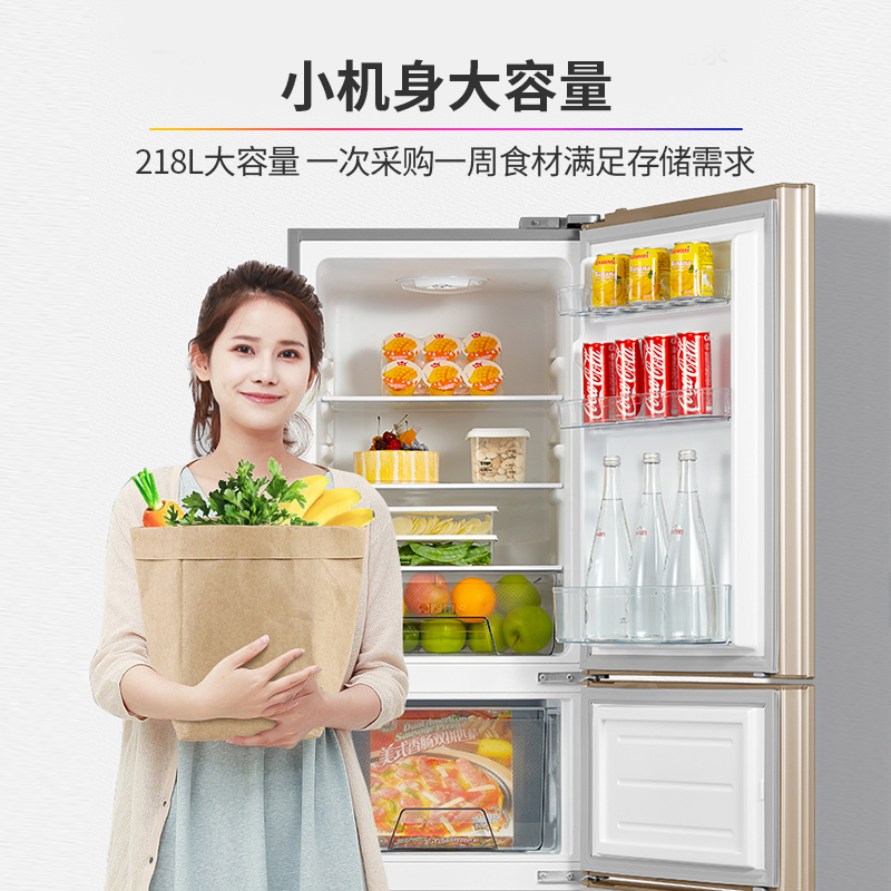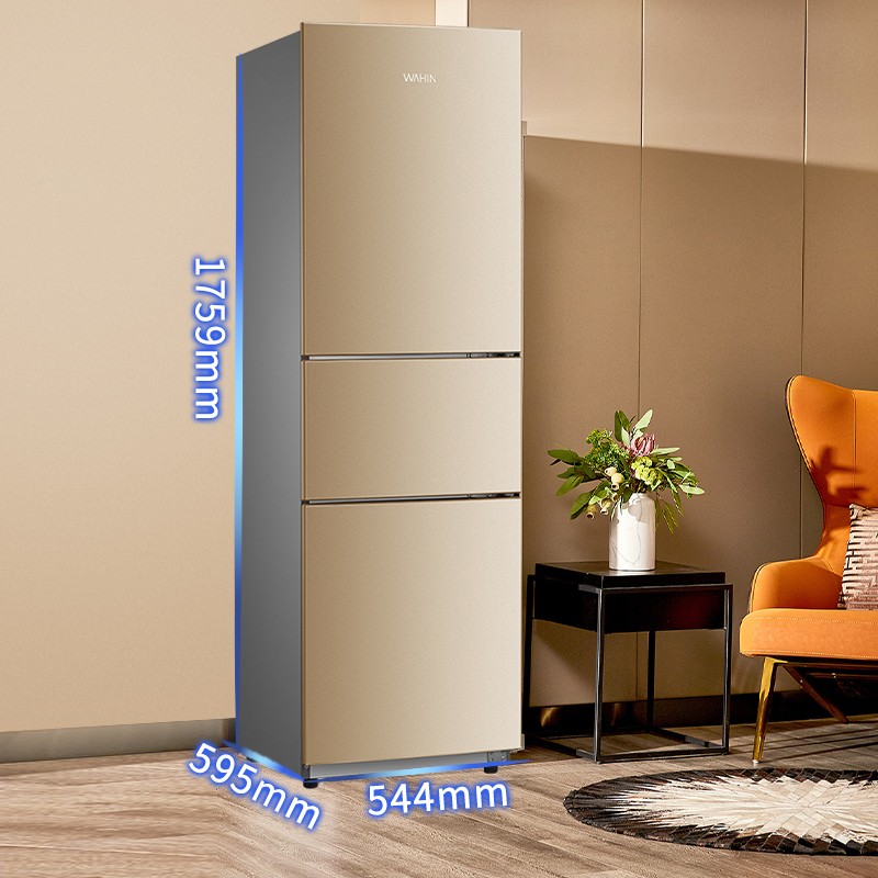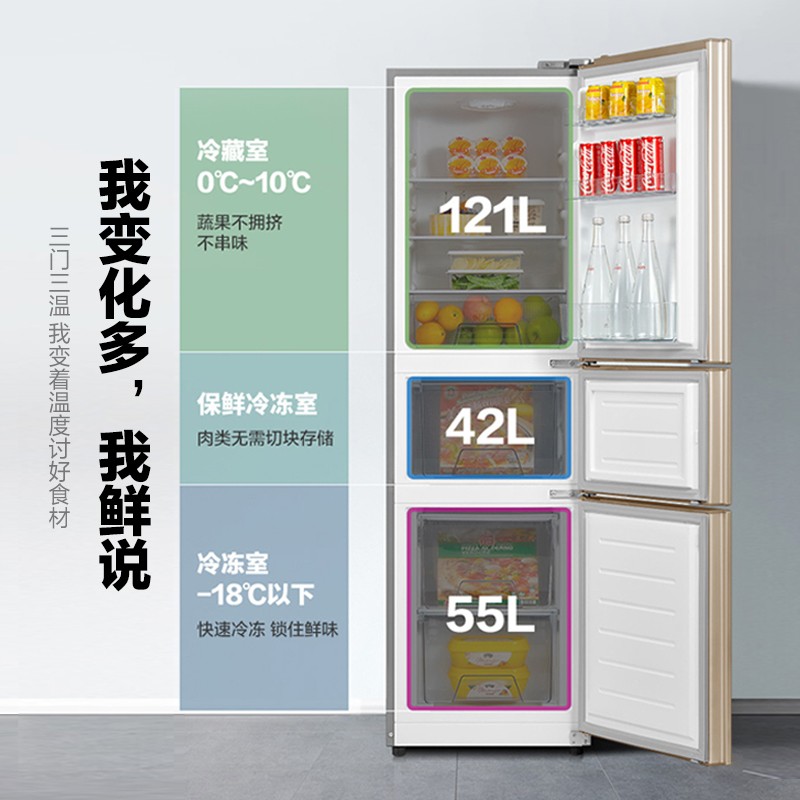 华凌 BCD-218TH 三门冰箱直冷循环,外观简约时尚,三门设计,中门-7℃保鲜软冷冻,三大温区不串味,36分贝低噪音,日耗电量0.49KW·h/24h,新国标2级能效,尺寸为595×544×1759mm