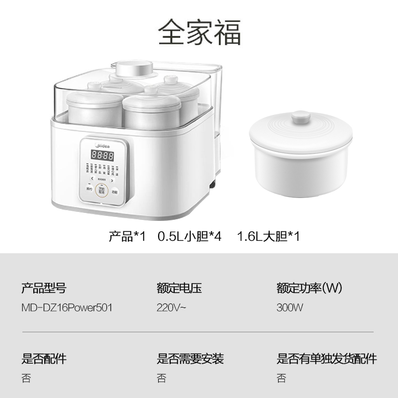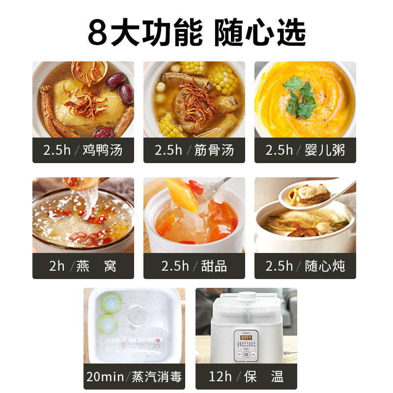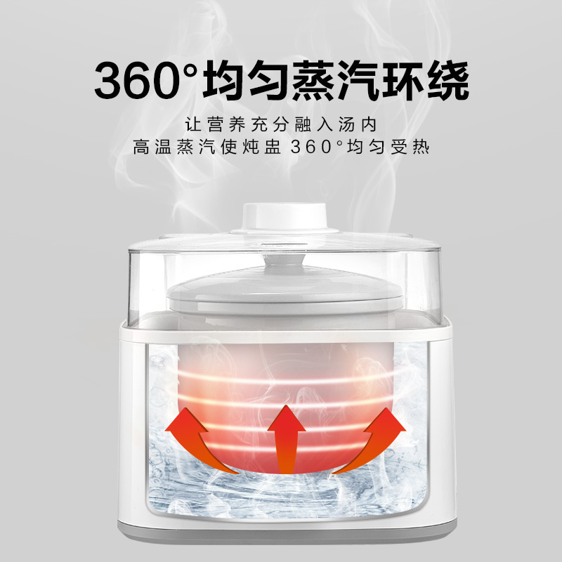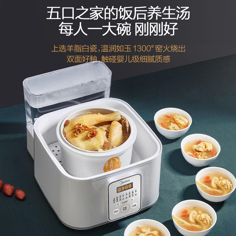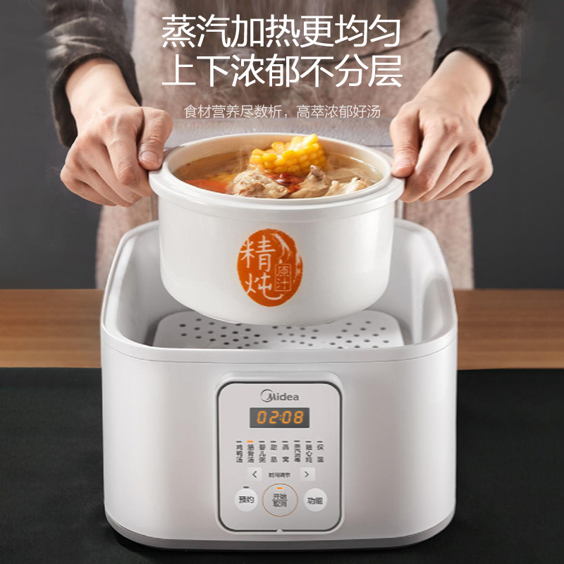美的(Midea)这款电炖锅采用白瓷炖芯,一锅五盅,立体受热,恒温析出食材原味。采用蒸汽循环加热,360°均匀蒸汽,汤汁浓郁不分层,让营养充分融入汤里,口感更香浓。分离式水箱设计,有效防干烧,独立设计加水方便。防烫把手,轻松开盖不烫手。