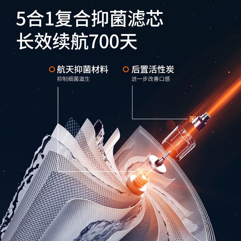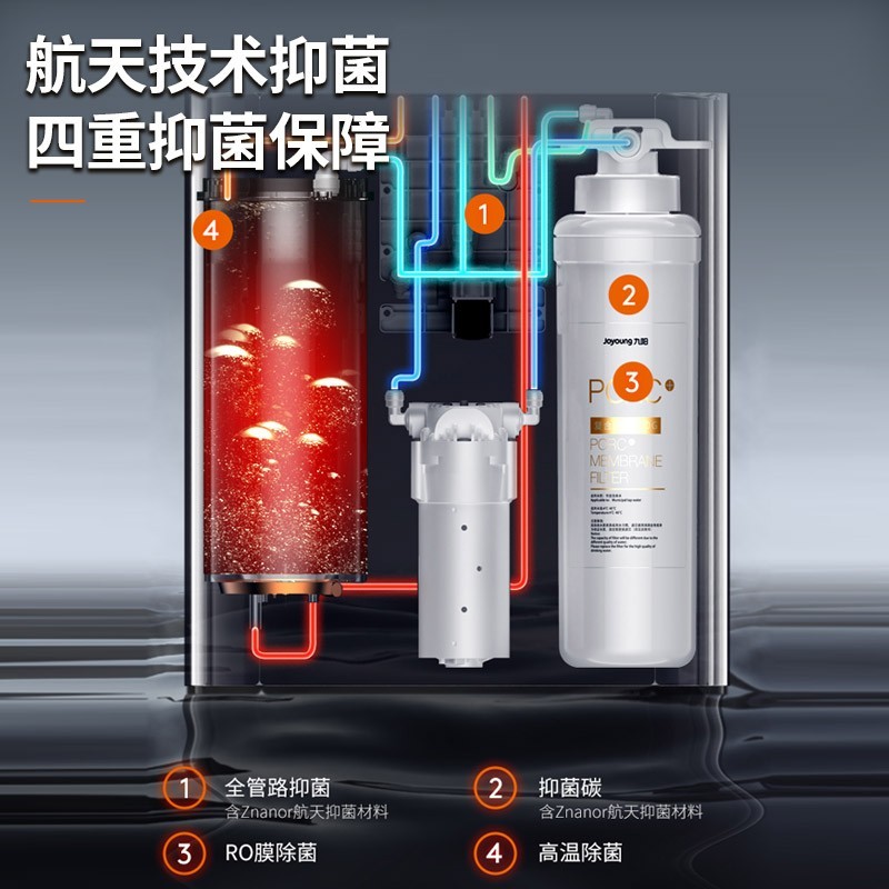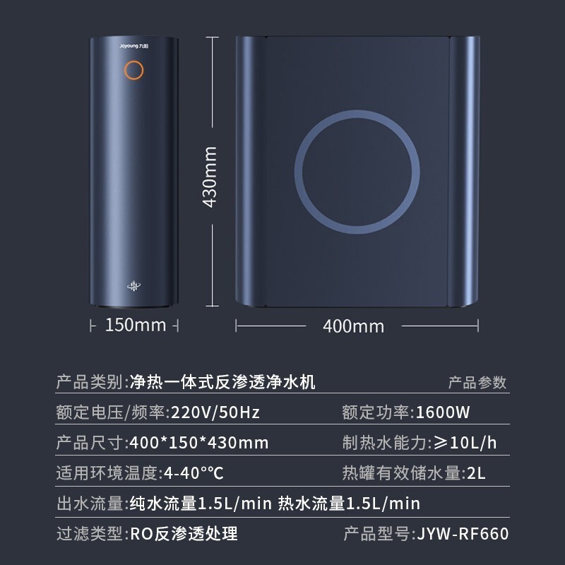 五合一复合抑菌滤芯,长效续航700天,滤芯采用航天抑菌V型膜,能有效提高出水速度,实现1.5L/min出水水速。航天技术抑菌,四重抑菌保障,Znanor纳米抑菌技术等四重保障,带来可靠的航天技术保障,避免水质二次污染。600G大通量,每分钟产水1.5L,纯净热水触手可及,告别传统烧水烦恼。九阳底盘速热技术,快速加热沸腾,自然降温保温,用尽自动补水,杜绝滚阴阳水,水质新鲜放心。额定功率1600W,产品尺寸400x150x430mm。