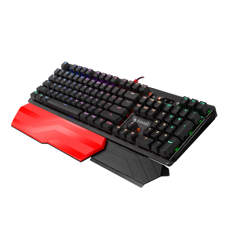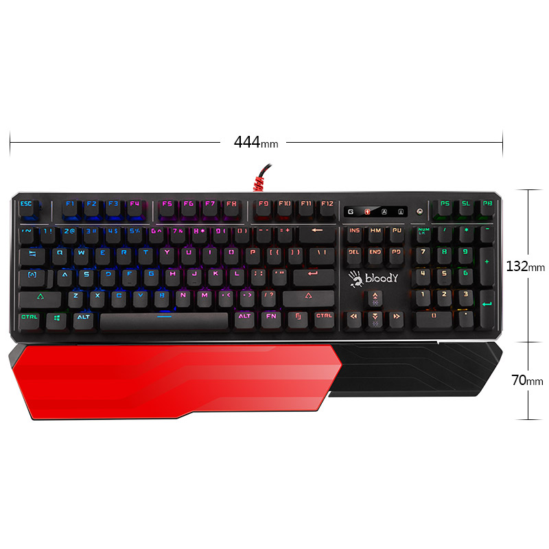 血手幽灵B975,为104键位光轴机械键盘,全键无冲,配有1680万自定义RGB背光,面板为阳极氧化工艺的铝材金属面板,键帽采用双色注塑工艺,标配可拆卸手托,键盘尺寸为444×132×27mm。
