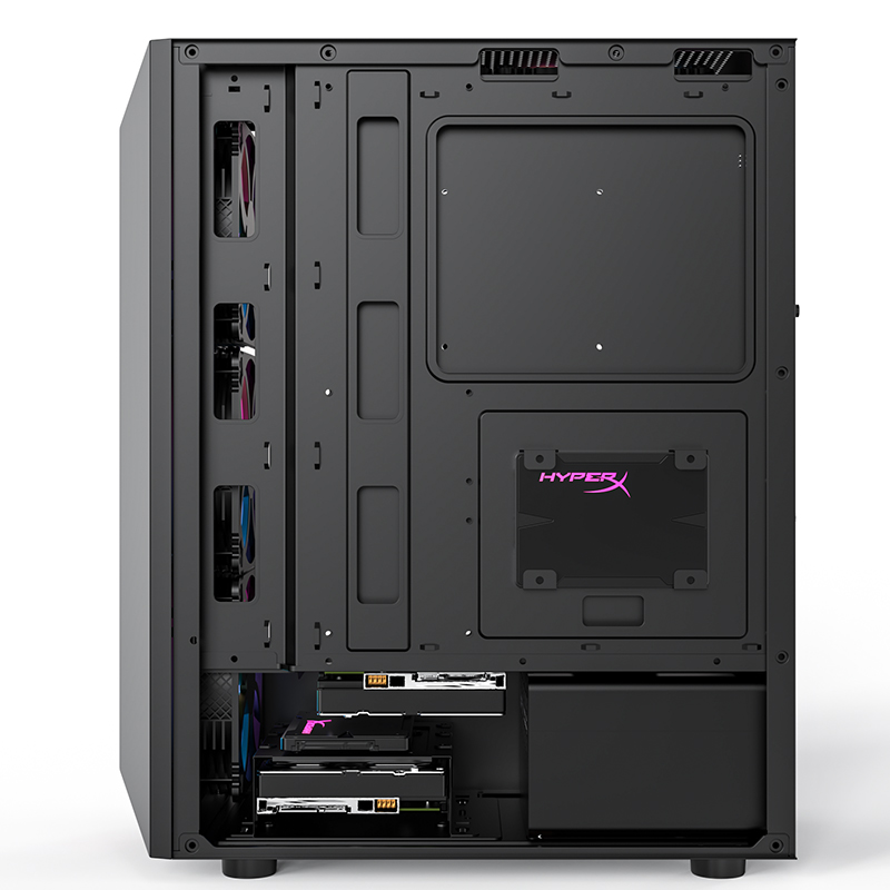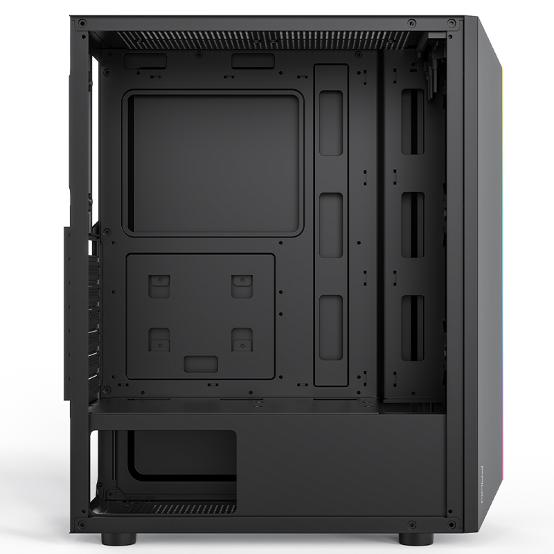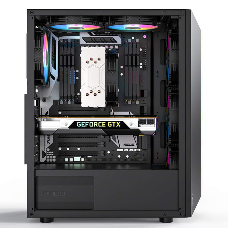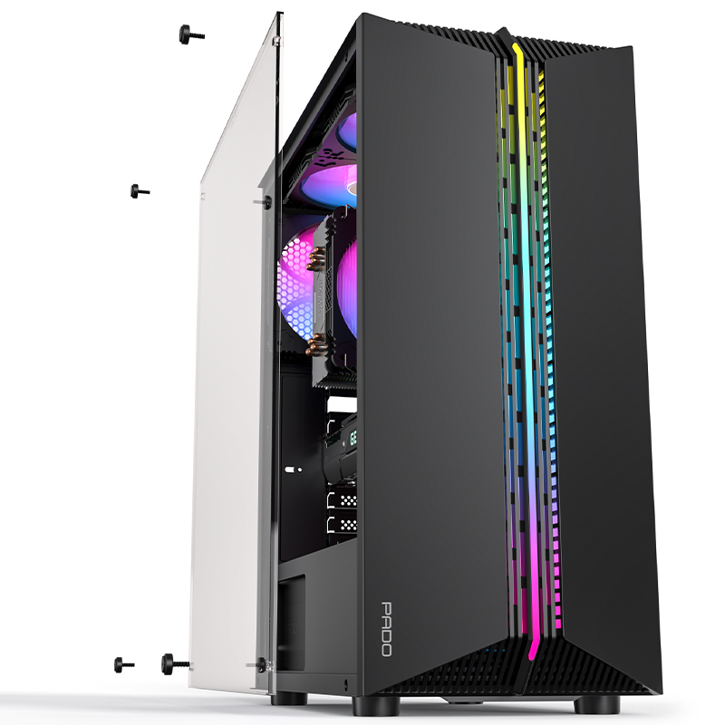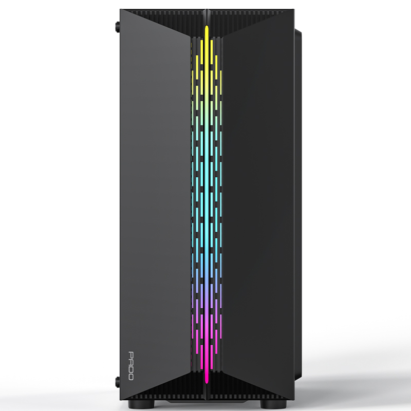 PADO半岛铁盒烈焰Z, 黑色游戏台式电脑机箱,机箱整机尺寸:363mm*206mm*432mm。亚克力侧透机箱,内部硬件一览无余,个性前面板,幻彩灯条,魅力四射,顶置/0接口设计,USB3.0*1、USB2.0*2、音频耳唛、重启键、开机键,散热方式,支持120mm风扇,支持240水冷,高兼容性,铁盒烈焰Z,支持市场上大部分硬件。