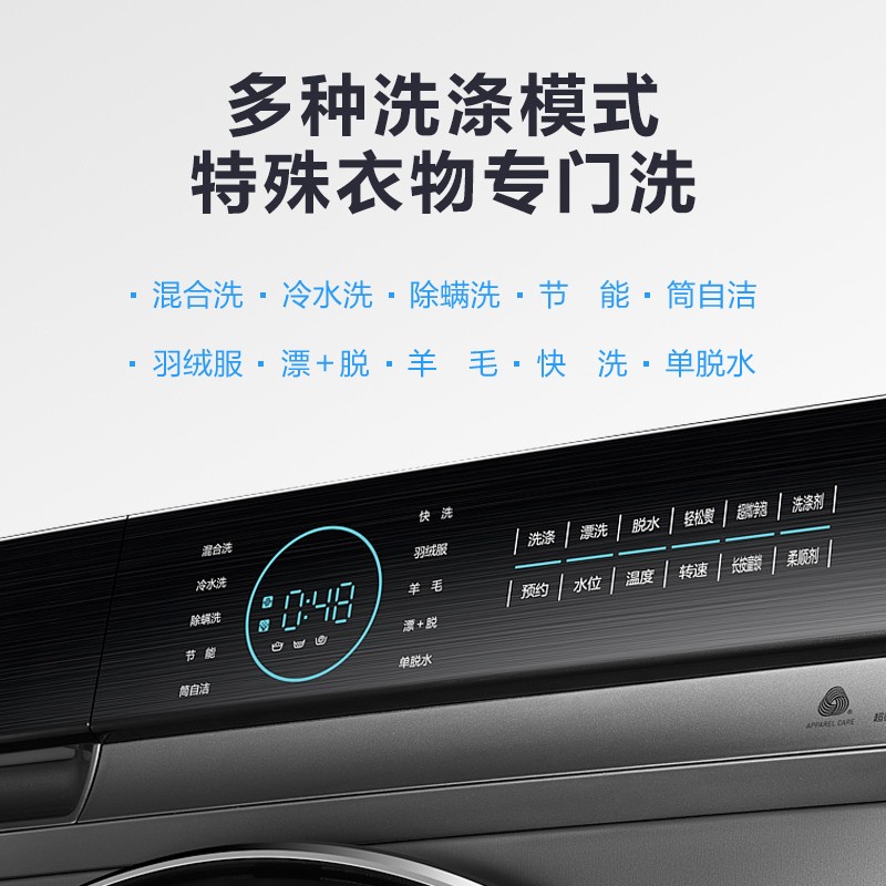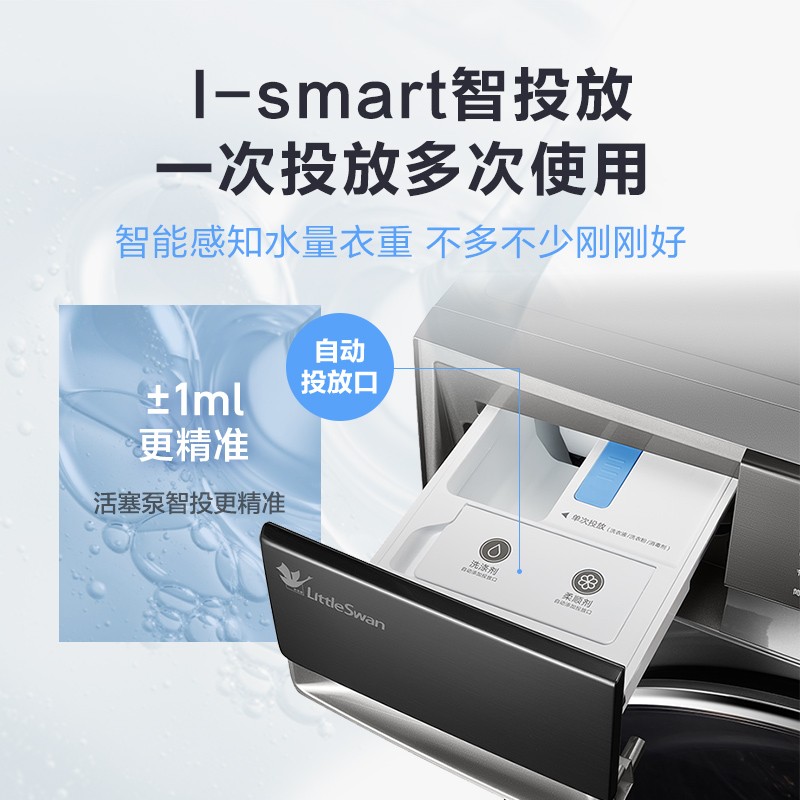 小天鹅 水魔方系列 TG100V88WMUIADY5 滚筒洗衣机,搭载有最高转速1400转/分钟的BLDC变频电机,配合可深入衣物内部的“超微净泡洗”,实现高效去污洗涤,洗净比高达1.08。水魔方冷水洗程序,让澎湃洗涤水流,强力穿透衣物,达到了揉搓的效果,冷水护色的同时保证洗涤效果,银离子健康除菌。具备有类似于“I-Dos”的“I-Smart智投放”功能,可实现洗涤剂自动投放,且投放误差维持在±1毫升。
