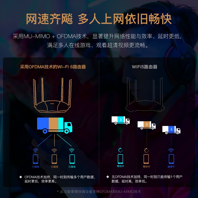 采用MU-MIMO+ OFDMA技术,显著提升网络性能与效率、延时更低,满足多人在线游戏、观看超清视频更流畅。2.4GHz和5GHz频段均采用2颗外置信号增强模块,同时提升信号增强和接受能力,覆盖范围更广。增强抗邻居家Wi-Fi干扰的能力,有效缓解同频干扰。支持IPV6海量IP,上网更顺畅。支持TWT用时唤醒,低功耗长续航。