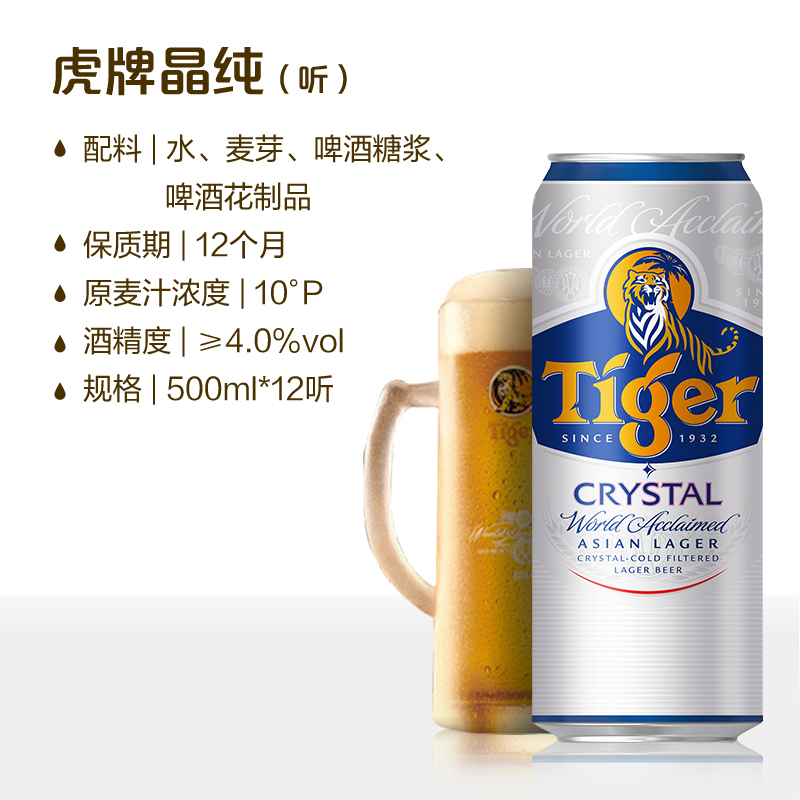 虎牌啤酒比较少推荐,但想必喜欢啤酒的朋友对其都不陌生吧。号称新加坡亚太酿酒集团的旗舰品牌(喜力也是亚太酿酒集团的),在8个国家设立了工厂生产,市场遍及全球,在东南亚啤酒市场有着领先地位,也在世界多地多次获奖。此款虎牌纯晶啤酒主要原料味水、大麦芽、啤酒糖浆和啤酒花,酿制过程采用微生物澄清技术,不使用澄清剂。酒精度4%vol,原麦汁浓度10°P。