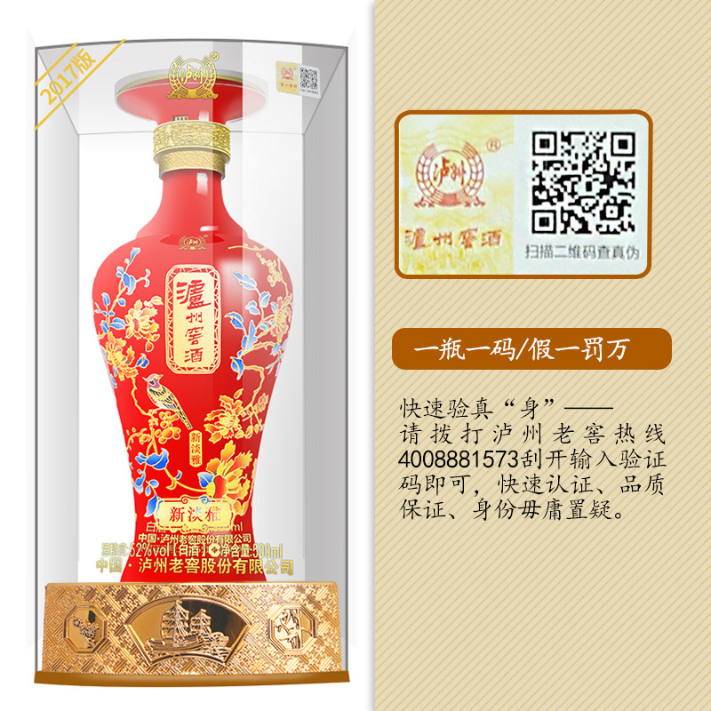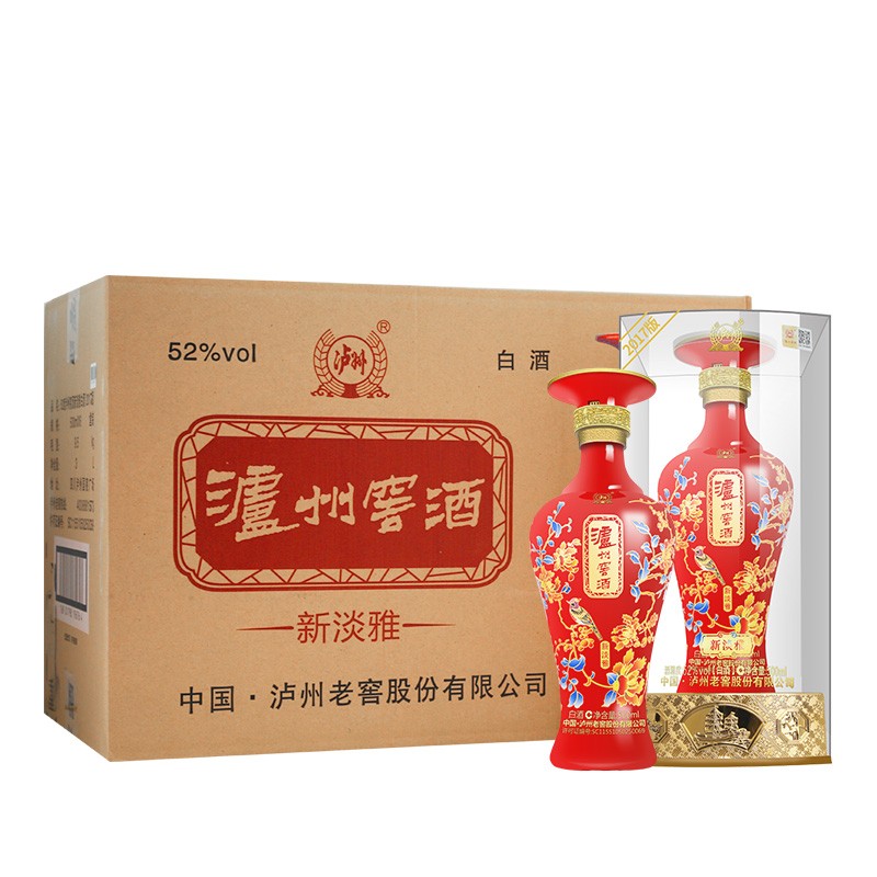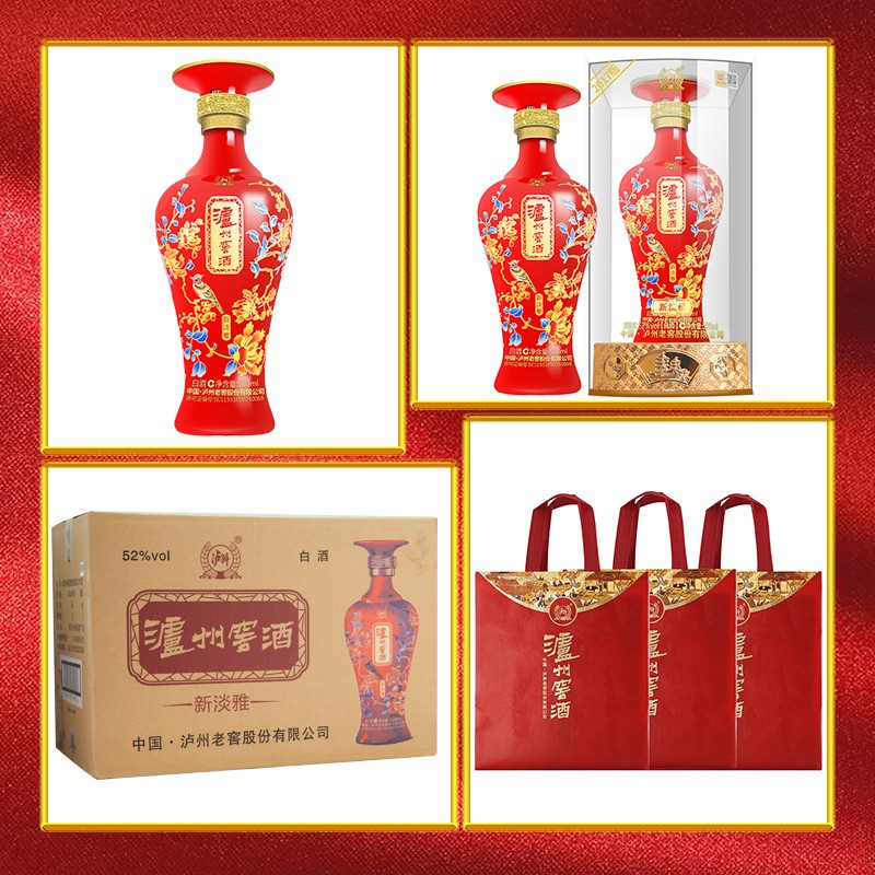 泸州老窖这款52度的浓香型白酒,选用水、高粱、小麦等原料,经过传统工艺酿制而成。酒液清澈透明,窖香浓郁协调,入口绵甜爽净,饮后回味悠长。瓶盖顶部花纹纹理清晰,色泽亮丽。牡丹花与喜鹊印花点缀瓶身,喜庆大气。瓶底纹路可防滑。建议在常温条件下储存。