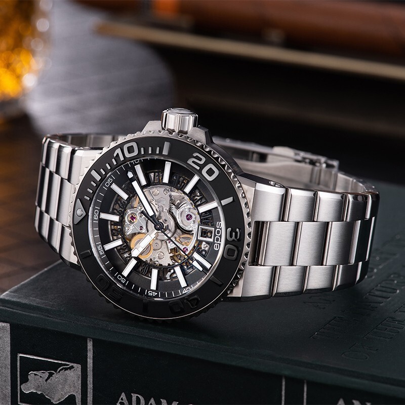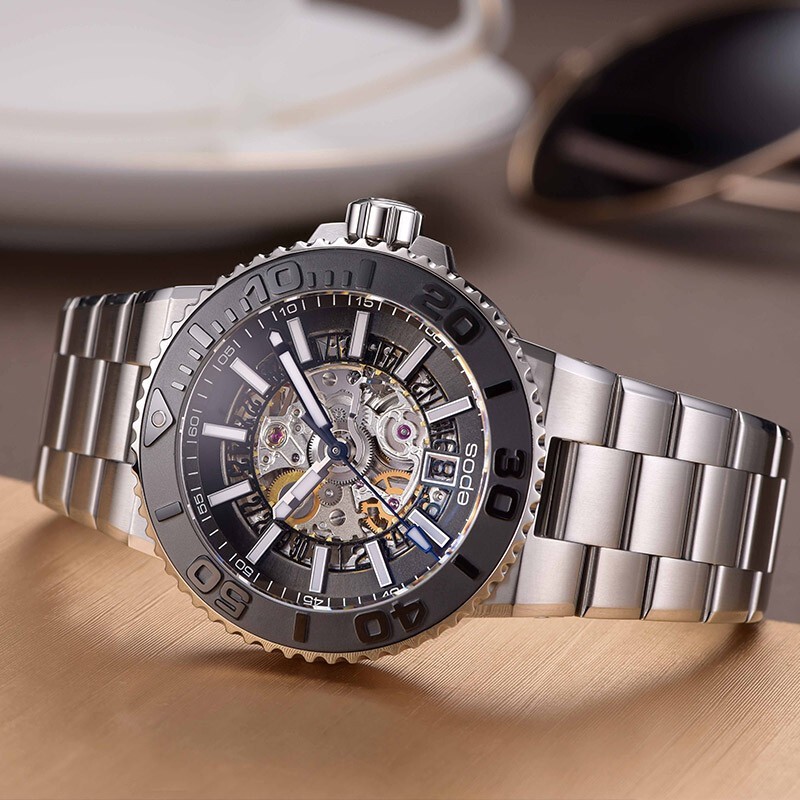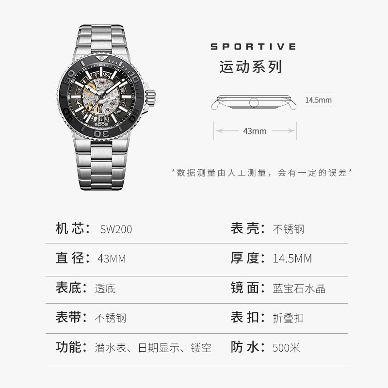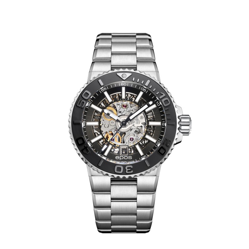epos 爱宝时 运动系列 男士自动机械表 3441.135.25.15.30,此款直径43mm,厚度14.5mm,表镜蓝宝石水晶,表底透底,表盘镂空,功能夜光,指针日期显示、夜光,刻度条形刻度,表壳不锈钢,表冠旋入式表冠,表带钢带,表扣折叠扣,表带颜色银色,大开面镂空设计,全镂空设计欣赏计时律动之美,配以日历轨道,丰富读时讯息,旋入式表冠,旋入式不锈钢安全表冠,镌刻“E”标志呈现品牌格调,背透表底,背透设计,见证机芯运转的魅力,细节处呈现匠心品质,三段式边缘抛光处理,硬朗有型,潜水专用表扣,安全帽折扣,佩戴紧贴舒适,防止意外开扣滑落。