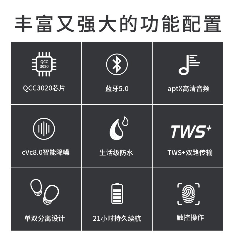 FW1采用了高通QCC3020蓝牙芯片,支持高标准aptX蓝牙编码格式。搭载高通蓝牙5.0方案,可以有效稳定信号和屏蔽干扰,传输速度可达3.0M/s。同时为了无线信号更稳定,FW1还采用了LDS激光直接结构天线,不仅可以提升传输距离,还加强了穿透力和抗干扰能力。续航方面,满电状态下,待机时间约80小时,可持续通话/听音乐约7小时。