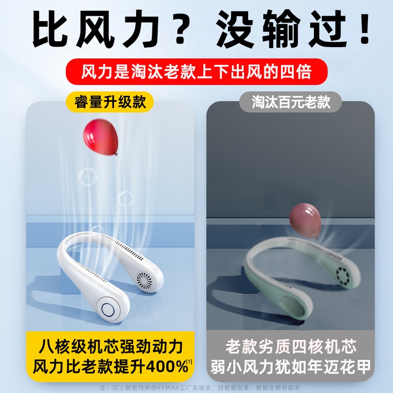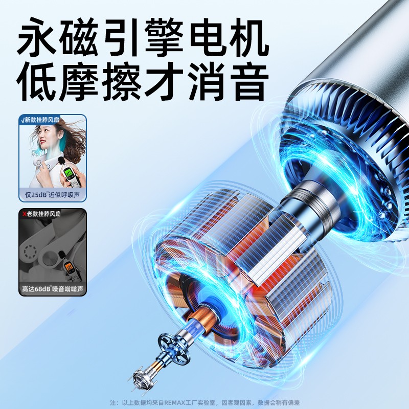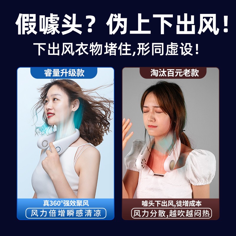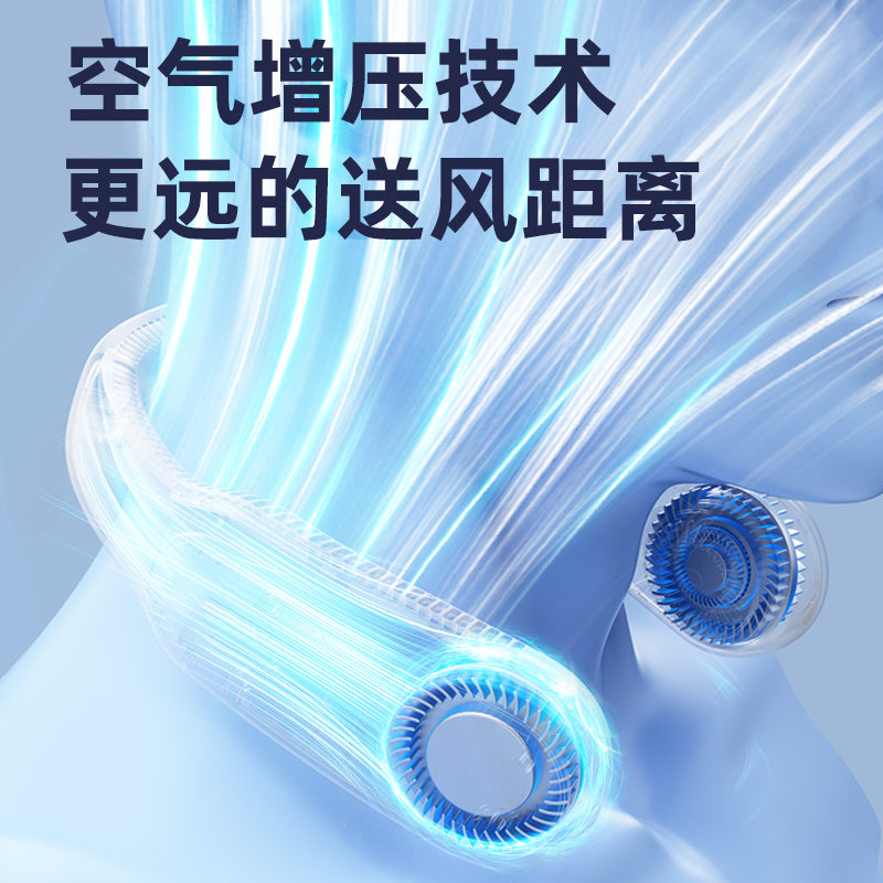 环绕式出风口,全方位环绕出风,涡轮增压扇叶,三档风力轻柔/强劲随心切换,凉风不止一种。两侧双涡轮鼓风设计,24片扇叶聚风,减少空气波动。扇叶全包,不会缠头发。强动力无刷电机,搭配多级风道设计,有效降低噪音干扰。2000-4000mAh大容量续航,一次充电用很久,7小时续航。高韧性软管,角度任调,TPU软胶材质,亲肤贴合不易断。