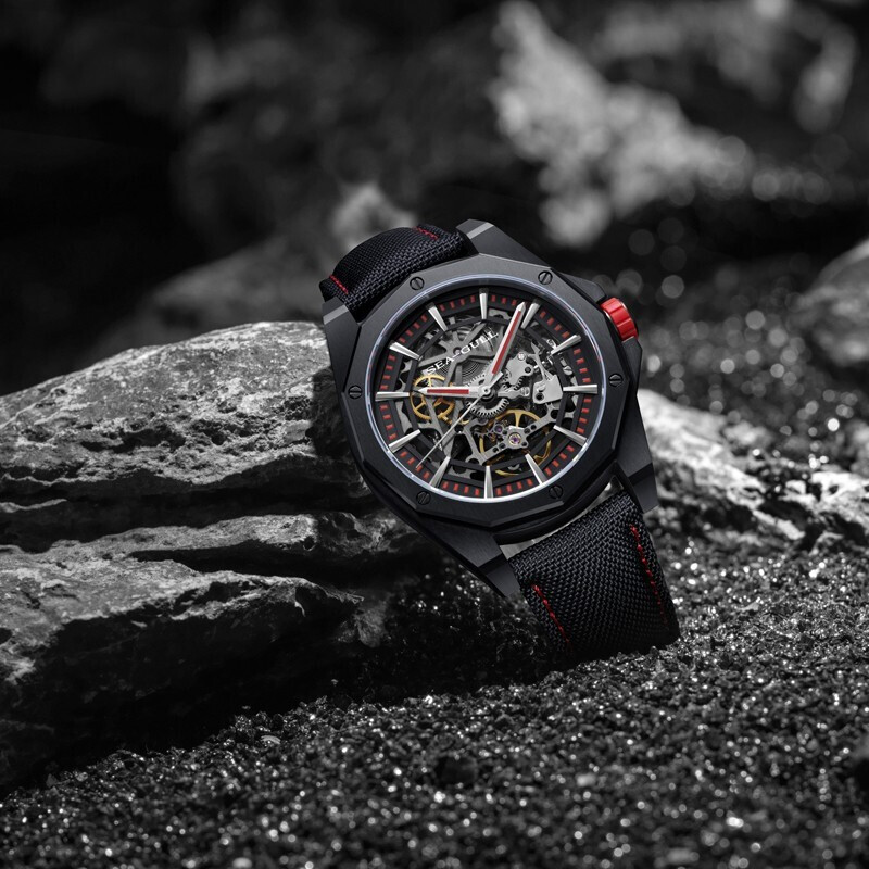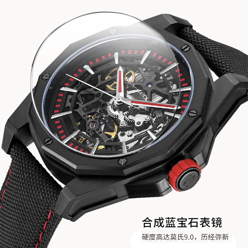 SEA-GULL 海鸥 YS11326095K12 男士镂空机械表,简约条棍刻度,剑型烤蓝色夜光指针,多边形精钢外壳螺纹表冠。