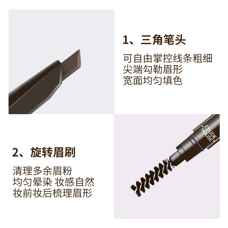 这款眉笔是ETUDE HOUSE 家的当家产品之一,采用三棱柱笔芯设计,可依据眉毛生长方向,勾画自然精致眉形。富含维他命E精华,质地柔和不含刺激皮肤的物质,防水防汗配方,持久不易晕妆。可以轻松卸除,轻松简单。
