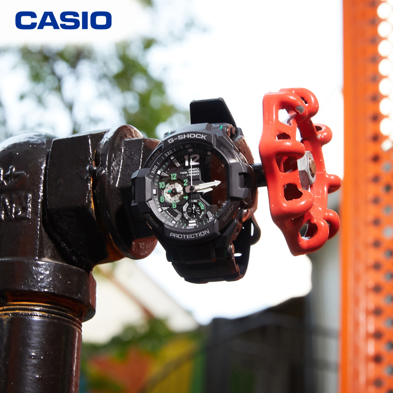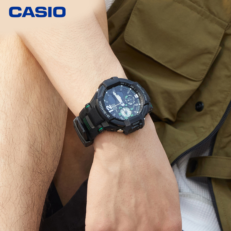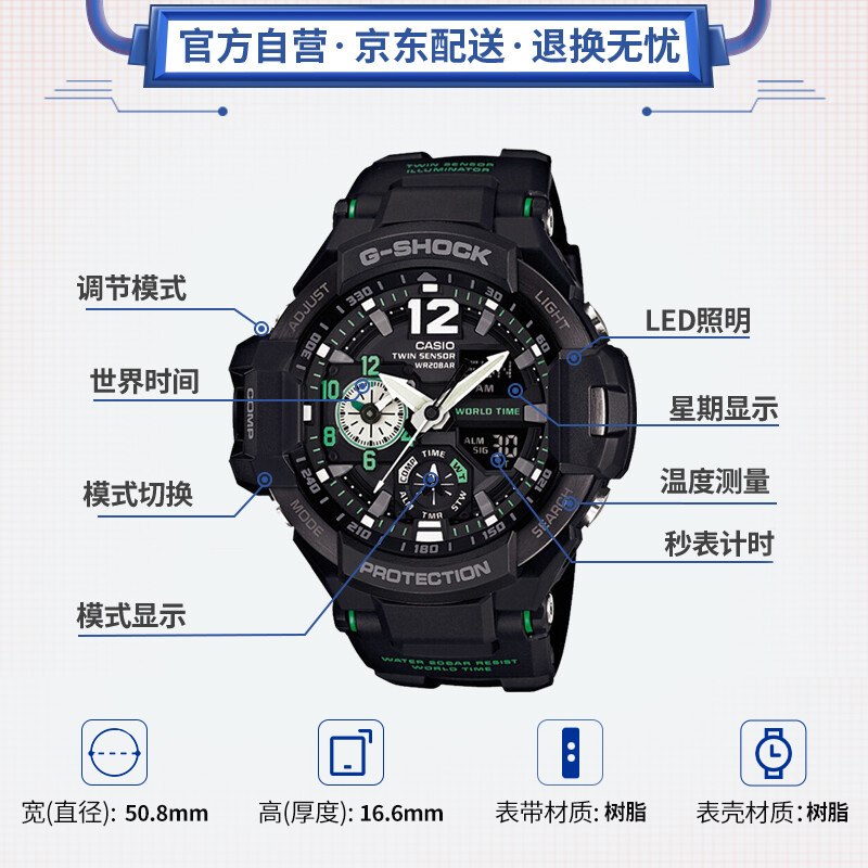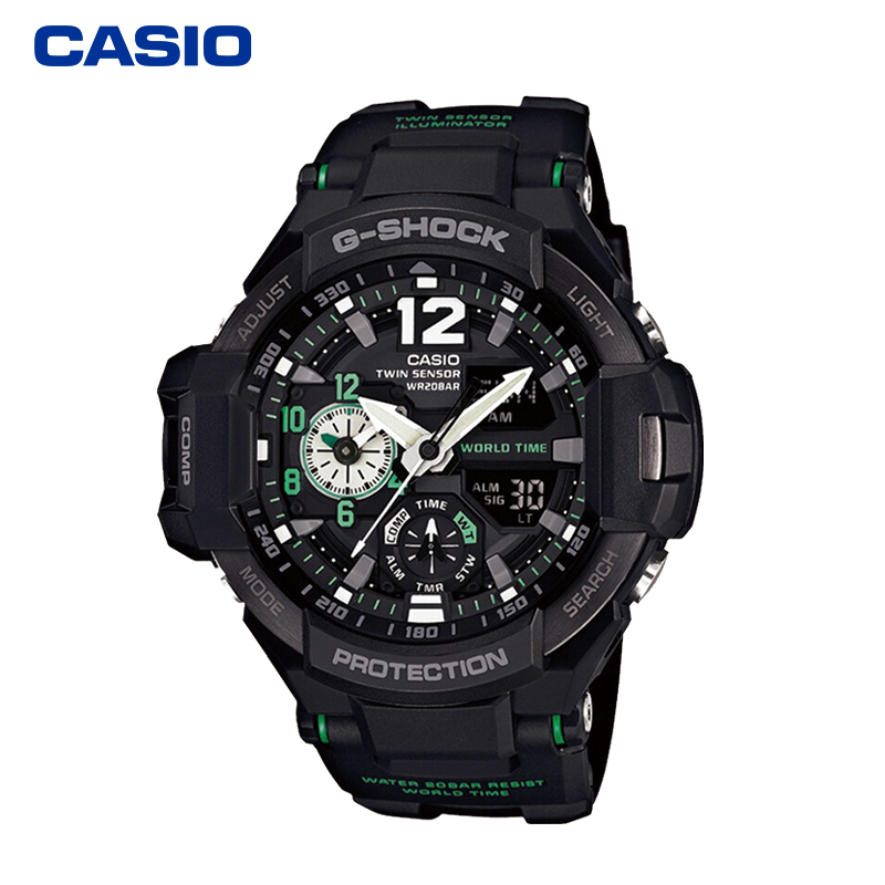 GA-1100是卡西欧非电波航空款腕表GA-1000的进化表款。配备双重感应器,可同时显示两地时间,表盘设计灵感来源于航空仪表盘。50.8*52.1*16.6mm的大表盘,显得很man、很cool。GA-1100具备200m防水、夜光、秒表、闹铃、日历、世界时间、罗盘,温度等多种功能。