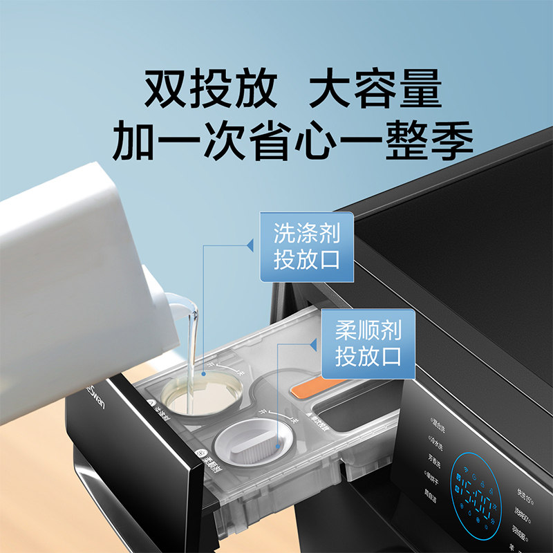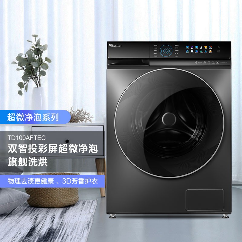 小天鹅( LittleSwan) 水魔方系列TD100AFTEC洗烘一体机,洗涤容量10kg,支持超微净泡洗和智能投放,配备全触控炫彩大屏,采用活性银离子全时巡航主动除菌,内置三个NTC传感器,实时监测筒内温度及干衣程度,洗净比1.08,产品尺寸595*530*850mm。