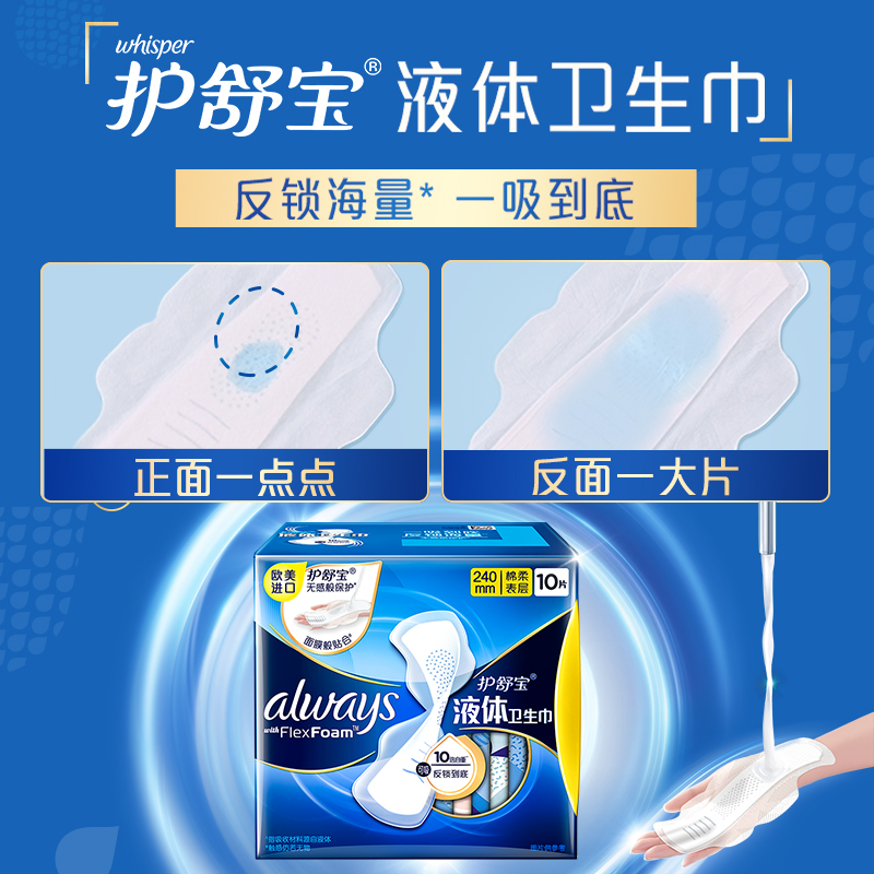 这款whisper 护舒宝 未来感·极护液体敏感肌系列液体卫生巾,采用源自液体材料FlexFoam,由水和纳米级分子聚合物通过乳化技术液化而成,贴合不同女性的身体曲线。尾部条状凹槽,帮助3D贴合,10倍吸收,柔软贴合,不惧变形,让表层干爽好洁净,吸水性也强。棉质表层保证舒适不致敏的亲肤感,减少侧漏和后漏的几率。