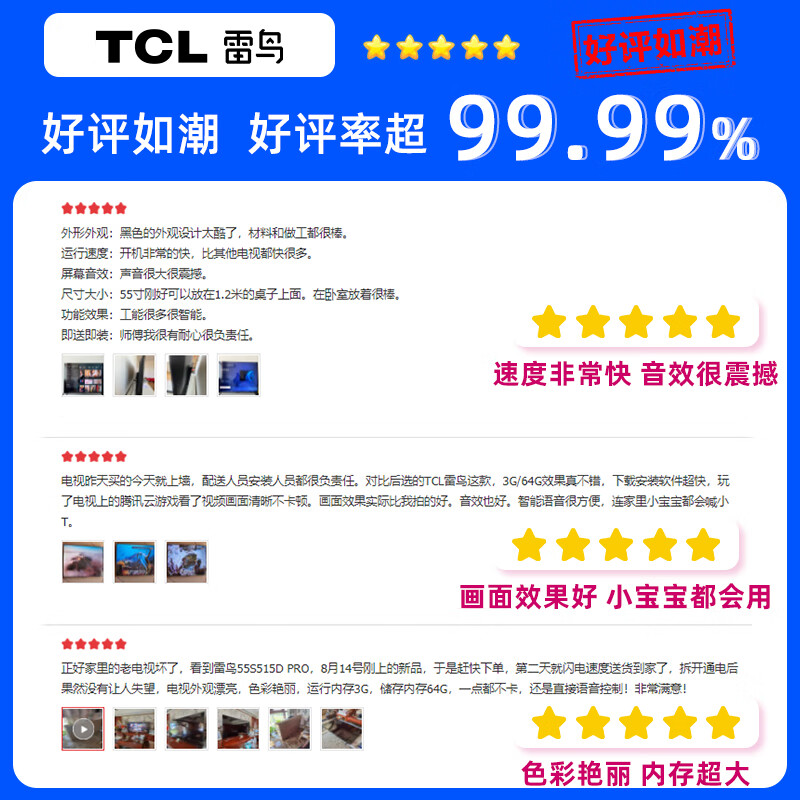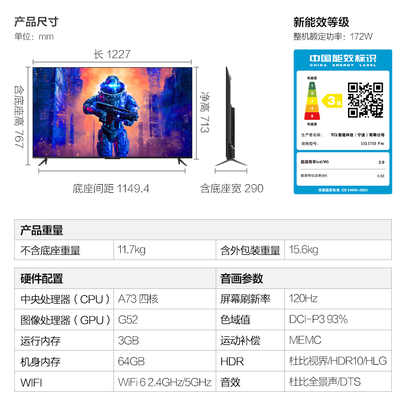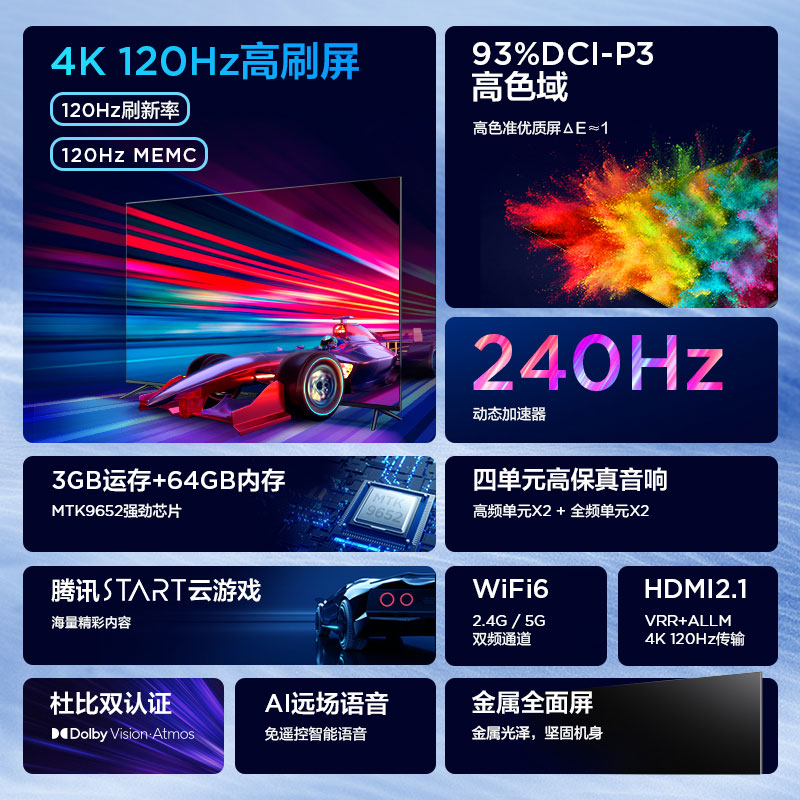 FFALCON 雷鸟 鹏6 Pro 55S515D Pro 液晶电视 55英寸 4K 93%DCI-P3高色域,以人类视觉体验为主导的色域标准呈现更加广阔的世界原色,采用6500K色温,呈现自然日光映照效果,杜比视界+杜比全景声,愉悦视听感官的游戏盛宴,国际专业认证的图像和声音处理技术,在家也能享受影院般沉浸式的视听娱乐体验,四单元高保真音响,独立腔体设计,超宽覆盖频段,效果更震撼,MTK9652强劲机芯,支持流畅操作,超大信息量处理,海量应用安装,WiFi和蓝牙传输更快更远更稳定,连接更轻松更流畅,同时支持2.4GHz和5GHz双频段信号;5GHz频段干扰少、延时低、连接更稳定,4mic远场拾音智能控制电视百呼百应懂你所需。