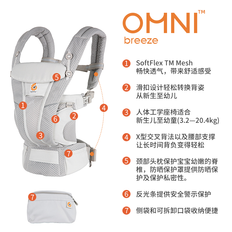 Ergobaby 婴儿背带,选用优质混纺面料制成,在肩带前端,背带的背部以及座椅位置,均采用了3D透气网布,大大增加了透气的范围,令整个夏天更加凉爽舒适。采用全新的双重锁扣设计,避免在前背脸朝外期间,宝宝玩耍扣子,发生肩带松落危险。全能四式背姿,满足妈妈日常出行带娃需要,一人也可轻松搞定,可根据宝宝的年龄及活动需要,调整背板到耳朵中部位置,头部及颈部提供成长型支撑。一片式折疊背板,给宝宝头部和颈部舒服支撑。