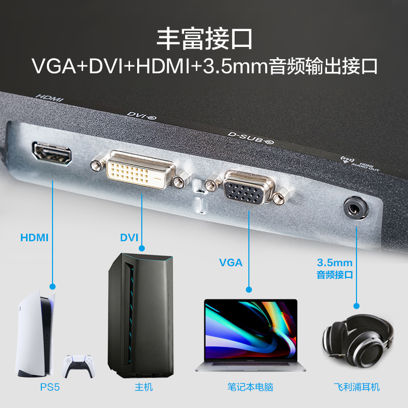 采用LGD原厂IPS硬屏,1920×1080分辨率,75Hz刷新率,98%sRGB,三边微边框,丰富、易用的接口,3.5mm音频输出接口,在HDM1连接时可单独输出音频信号至耳机或音箱,EasyRead易读模式文本悦读新体验。