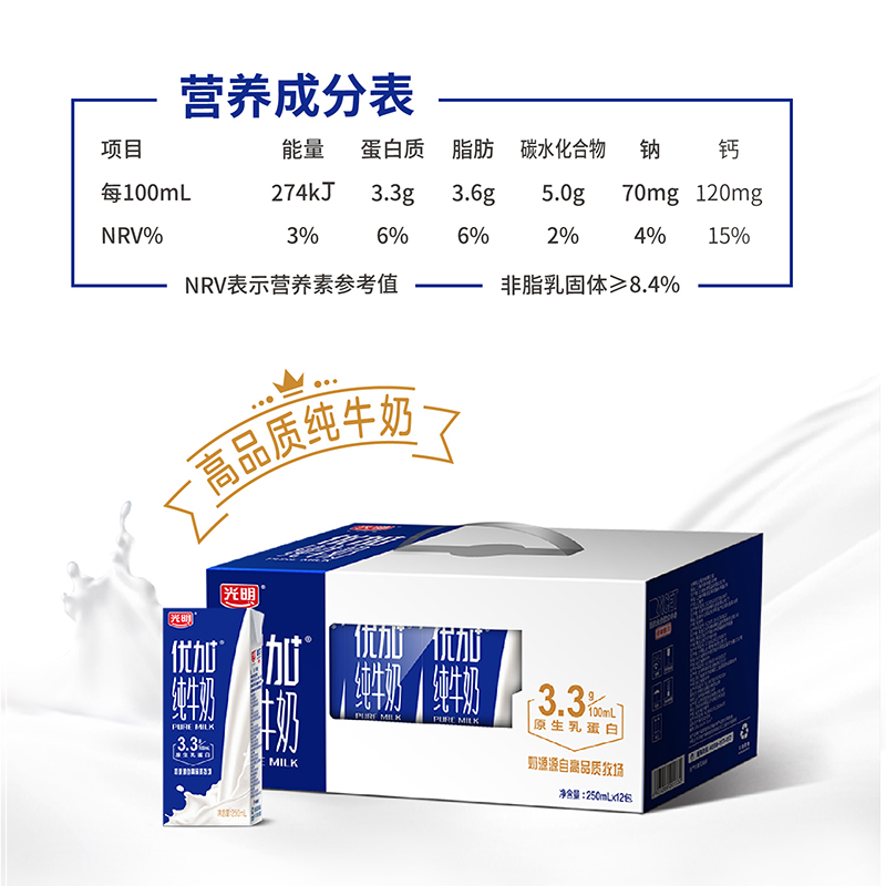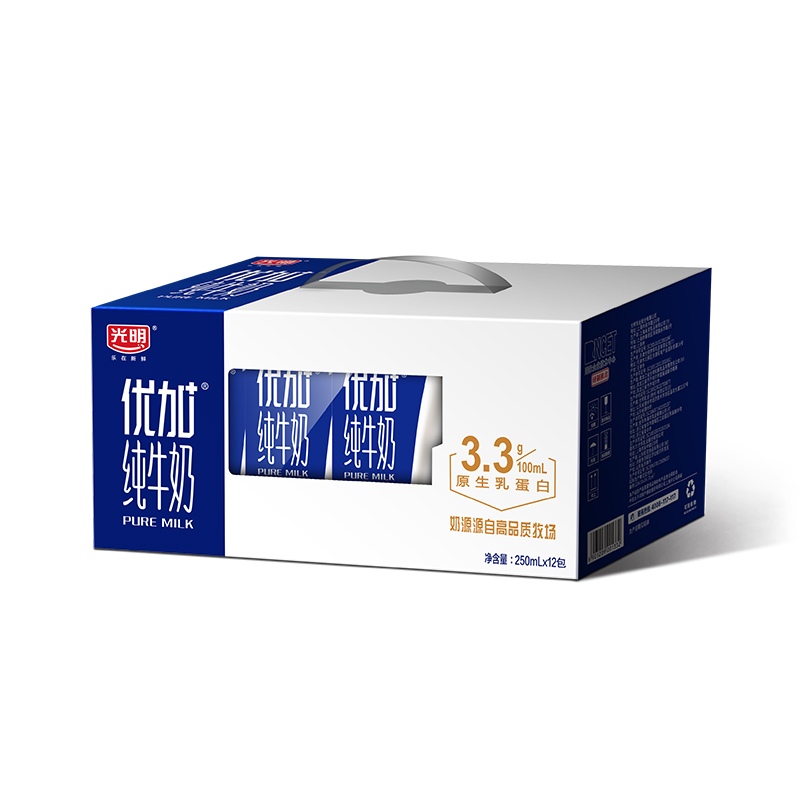 这款优+纯牛奶采用100%生牛乳,经超高温灭菌而成。味道清香,喝起来有感觉点甜,奶味比较纯正。蛋白质含量3.3g/100ml。规格:250ml*12盒~