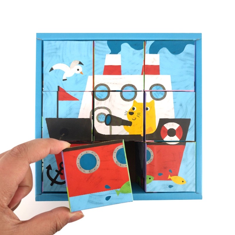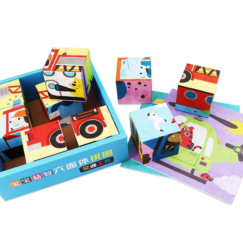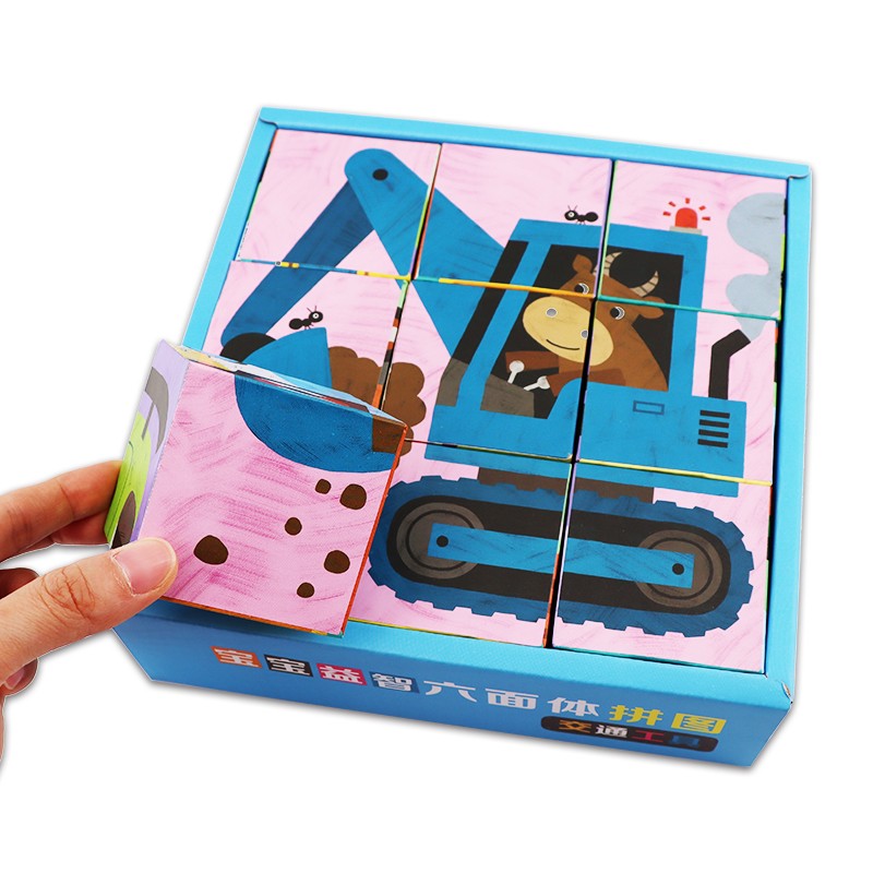 [立体积木拼图]更有挑战性,锻炼空间立体思维;9块大立方体组合出6幅不同图案,帮助宝贝理解局部与整体的关系,训练逻辑思维。辨识颜色、认知动物,9块积木每个面都有不同的背景色,便于宝贝分拣拼图和颜色认知;丰富的动物形象萌趣可爱,释放孩子自然天性.多种玩法更益智;积木叠叠乐——将积木自由拼搭,促进精细动作发展,提升耐心和专注力.看图说故事——根据拼好的画面进行情景对话,提升观察力和语言表达能力。