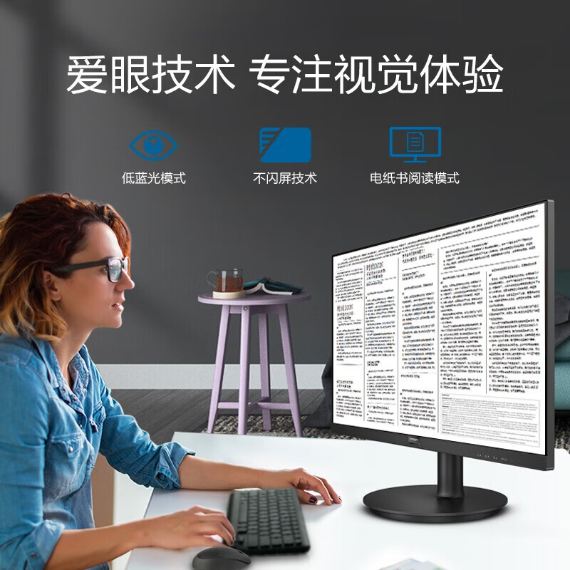 此显示器拥有1920x1080全高清分辨率,75Hz的高刷新率,画面不撕裂不卡顿。23.8英寸VA屏,178°广角,任何角度看都不偏色。1670万色彩,色彩过渡细腻,画面层次丰富。低蓝光不闪屏屏幕,有效减弱蓝光辐射伤害,保护眼睛,提供舒适的视觉体验。所用材质拥有RoHS安全认证,采用100%可回收包装材料,环保又安全。显示器还可壁挂,节约空间。接口丰富,有HDMI接口和VGA接口,可以适配大多数主流设备。