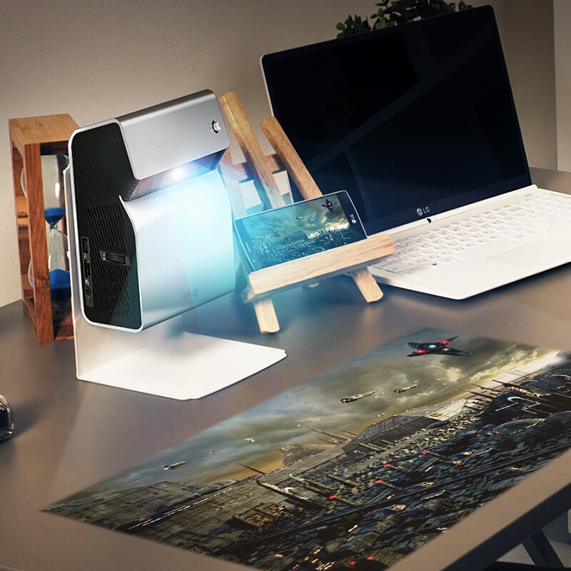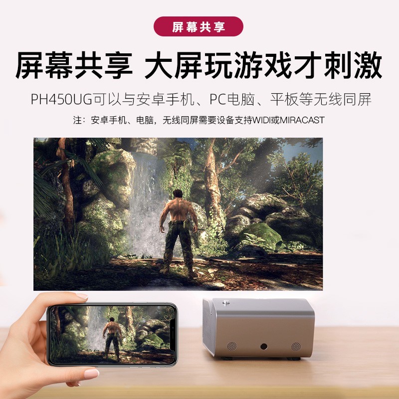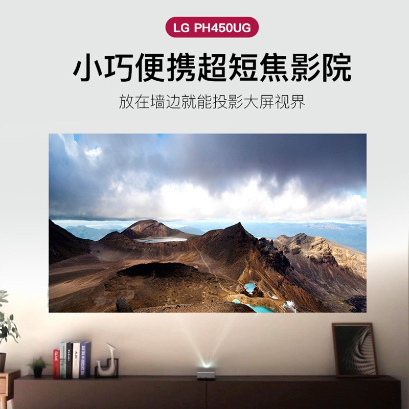 LG Minibeam PH450UG 是一款便携式的超短焦家用投影机,距离画面加上机身共53厘米,就可以投射出80英寸的大画面,让小户型也可以使用投影机。 在性能方面,LG PH450UG采用DLP投影技术,亮度为450ANSI流明,对比度达到了100000:1,支持1080p全高清分辨率。该机采用的三色LED光源,不拖影更流畅,配合专业的色彩调配算法,让您看到的每一帧画面都细腻生动,亮丽鲜艳。 在机身设计上,LG PH450UG小巧的机身仅有1kg左右,投影机配备USB接口、HDMI接口、Lan以及S/PDIF接口等,支持蓝牙音频输出及WIFI投屏,内置电池,满电可续航2.5小时左右,机身尺寸为宽13.2*长20*高8.5厘米。 此外,这款投影机可以与安卓手机、PC电脑、平板灯无线同屏,用大屏幕玩游戏更刺激。