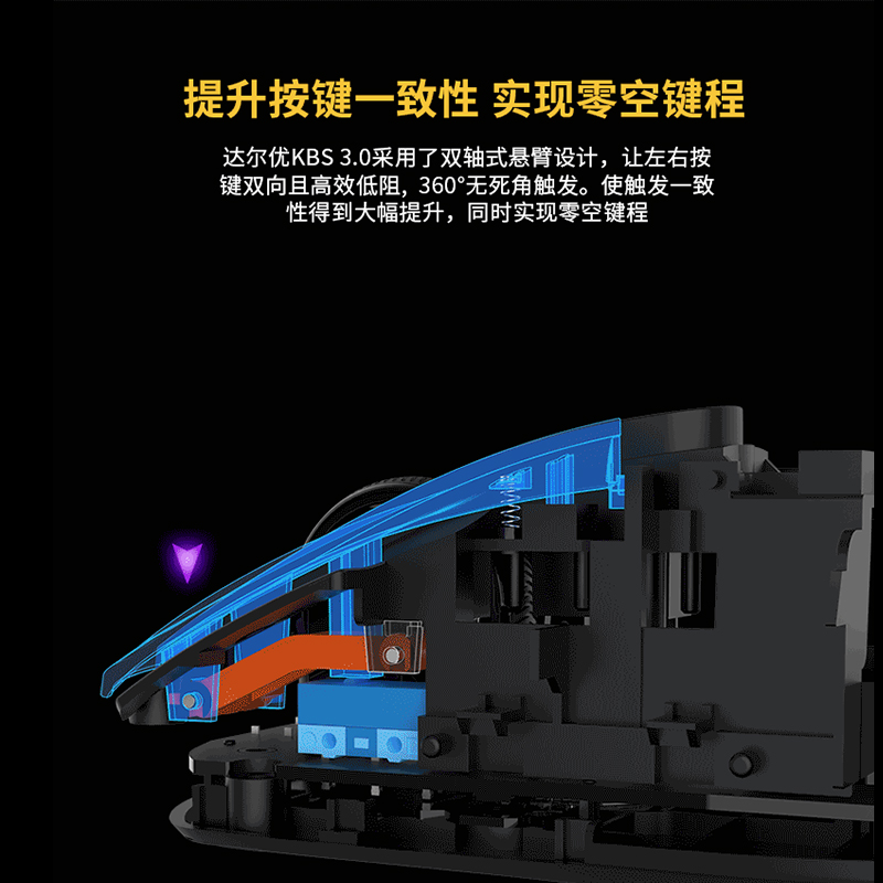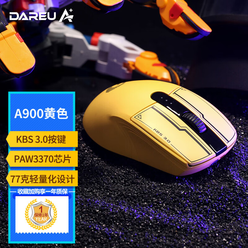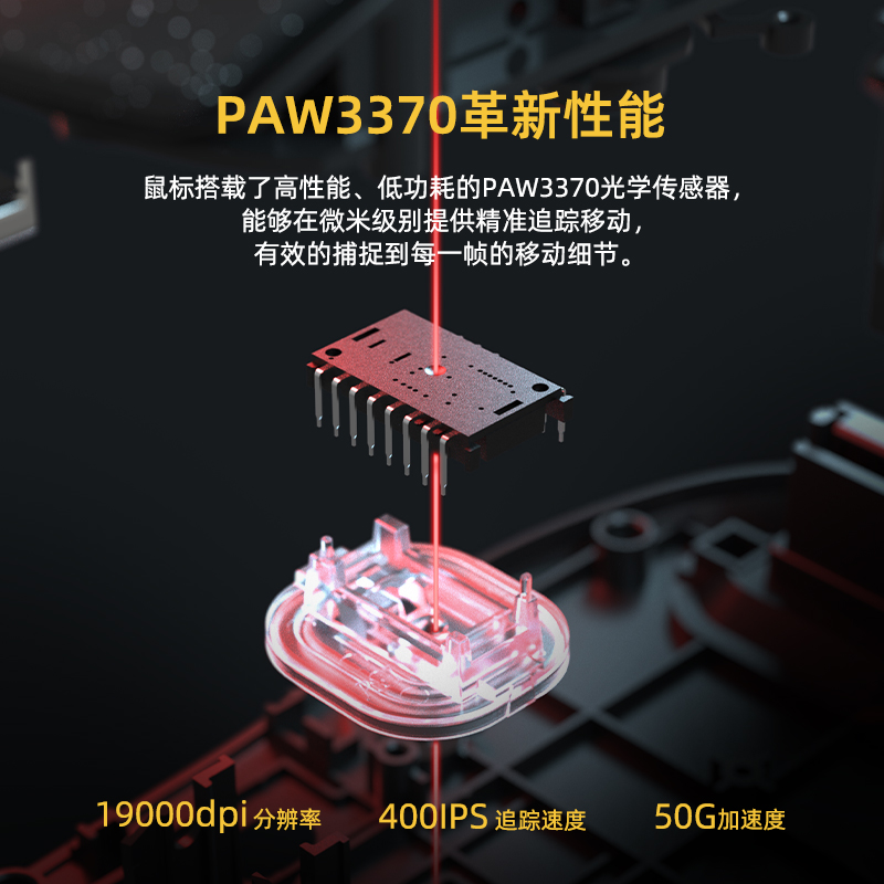 达尔优 A900,搭载快充技术,充电15分钟,可使用一周的时间,鼠标运用双轴式悬臂设计,让左右按键双向且高效低阻,360°无死角触发。搭载PAW3370光学传感器,19000DPI分辨率、400IPS追踪速度,50G加速度。有线和2.4G模式支持400、800、1600(默认)、3200、6400DPI。蓝牙模式支持800、1200、1600DPI。
