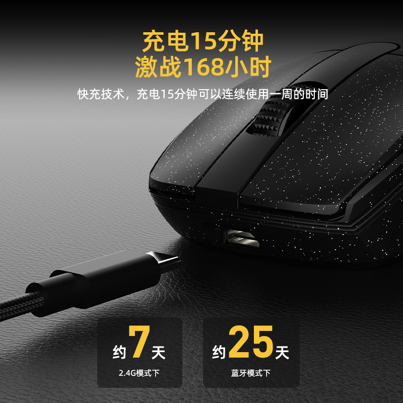 A900 采用77g轻量化设计,外壳轻薄,又坚固耐用,支持5千万次微动开关,享受三种连接方式:蓝牙、2.4G、有线连接。适配多种系统。
