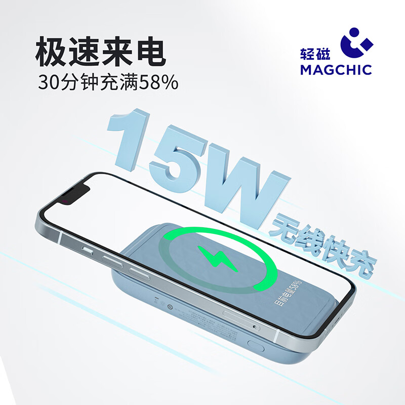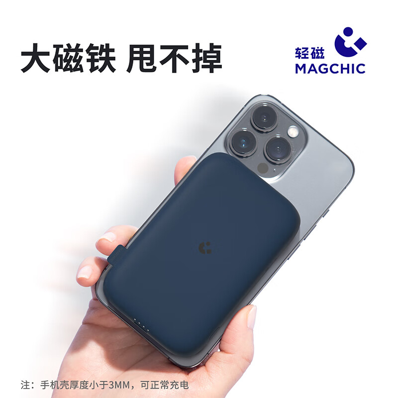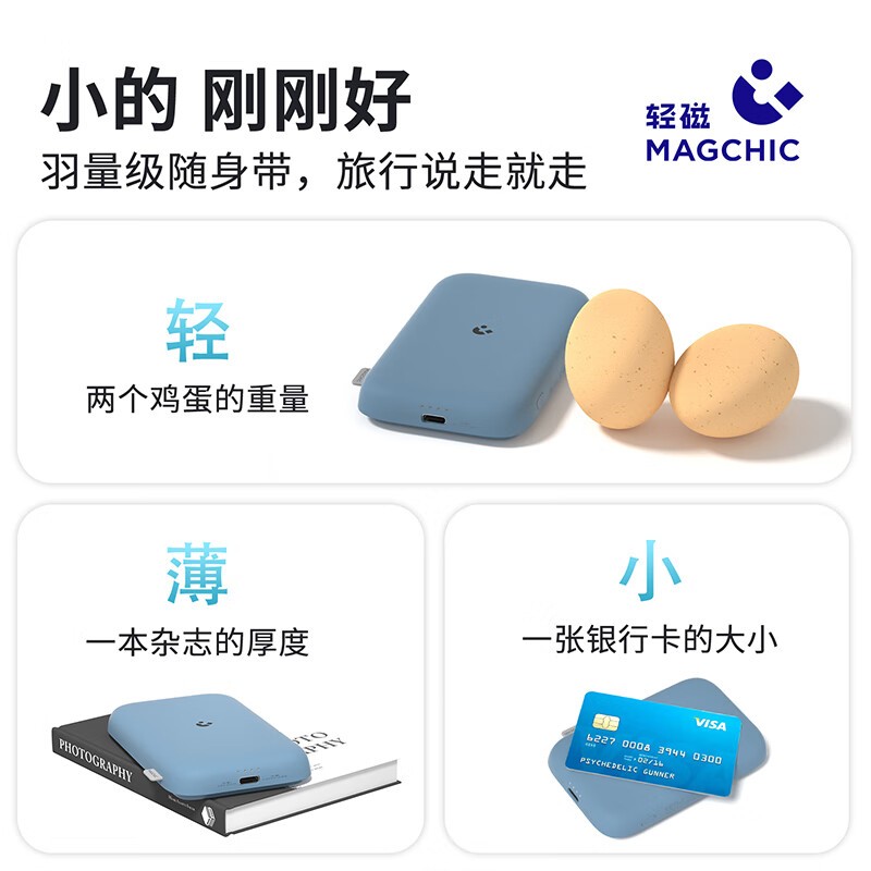无线充电可达15W,有线充电18W,5千毫安,银行卡般大小,仅有两颗鸡蛋的重量,强力吸附,不易脱落,ABS手感漆外壳,手感舒适细腻,尺寸为66*104*16mm。重133.5g。