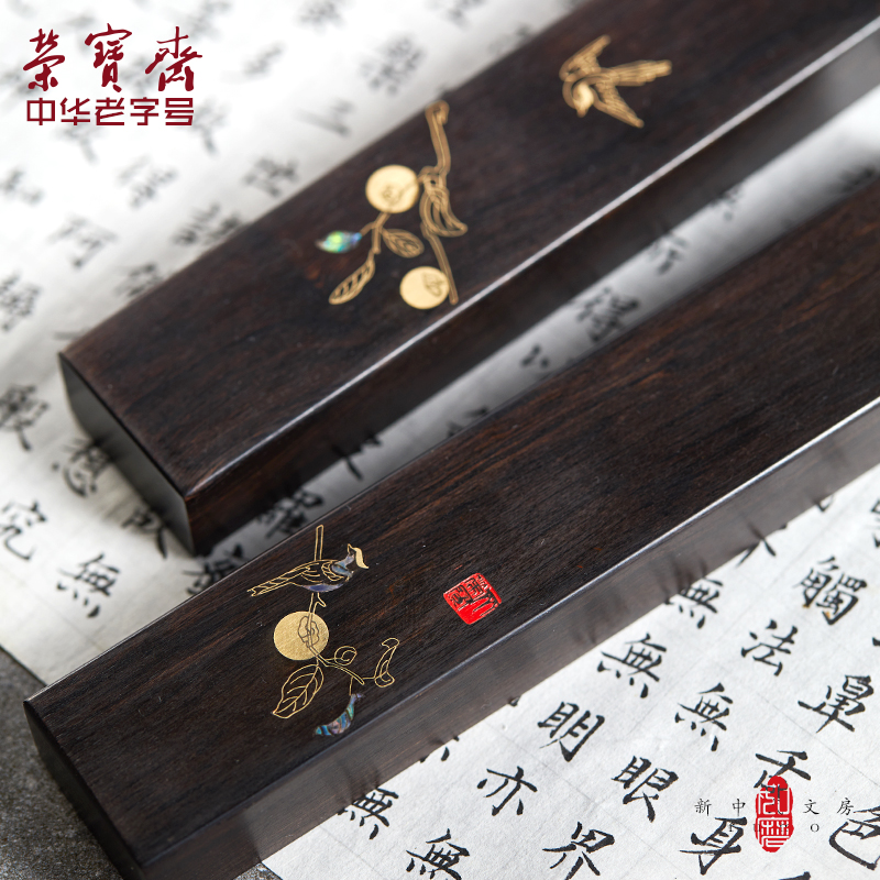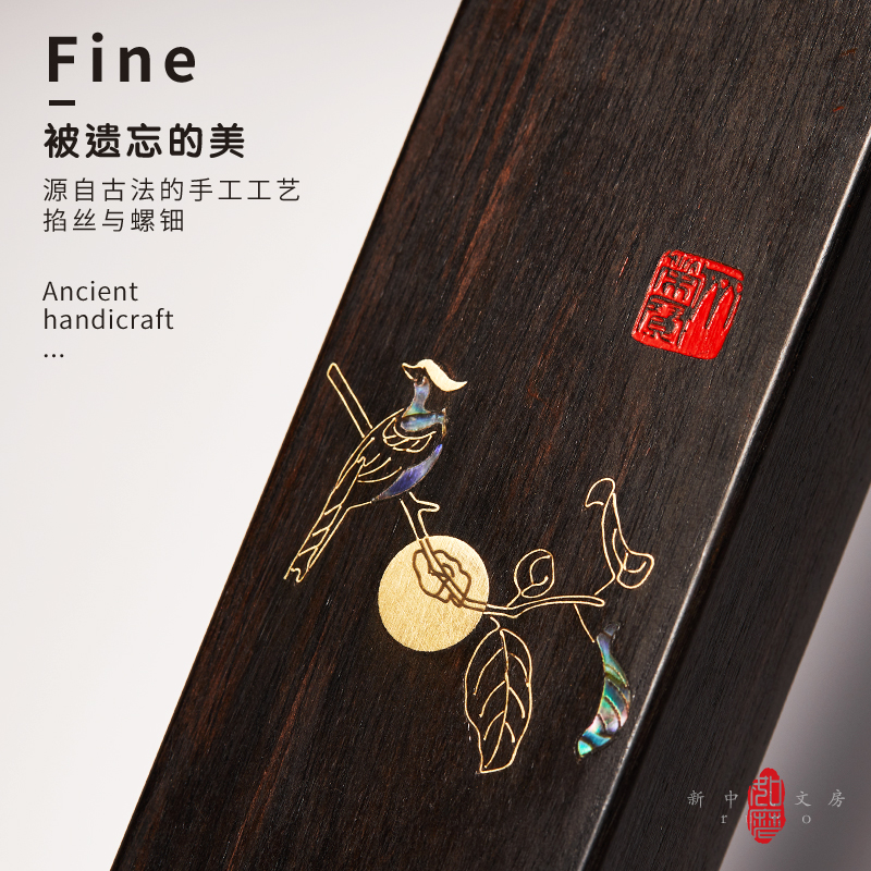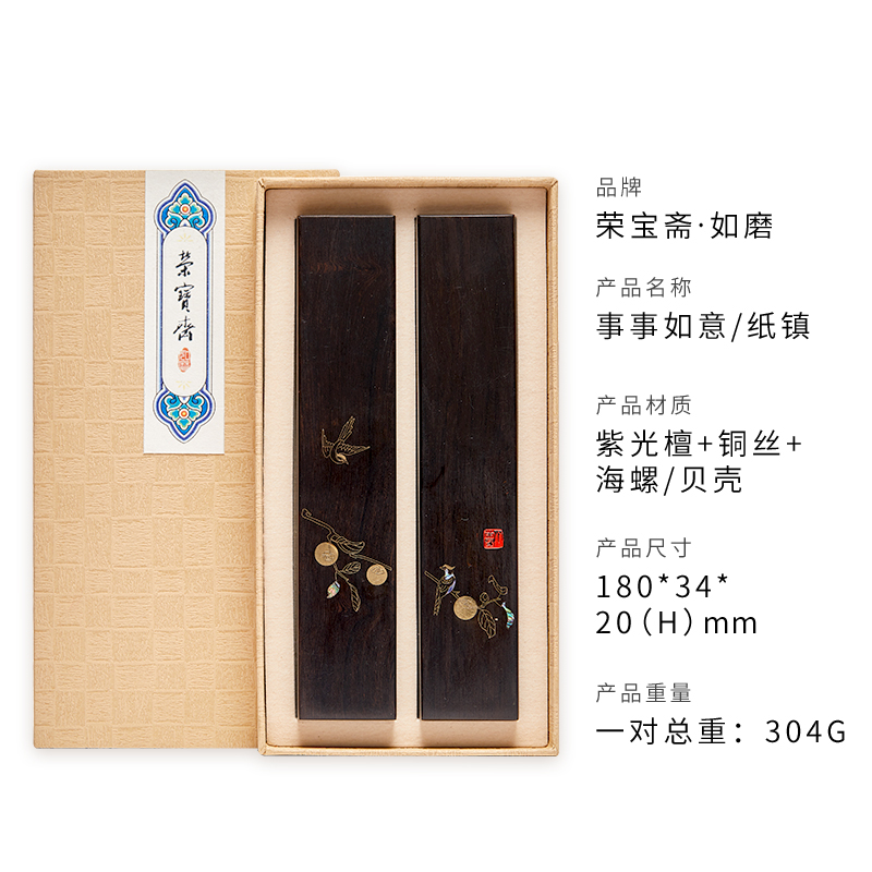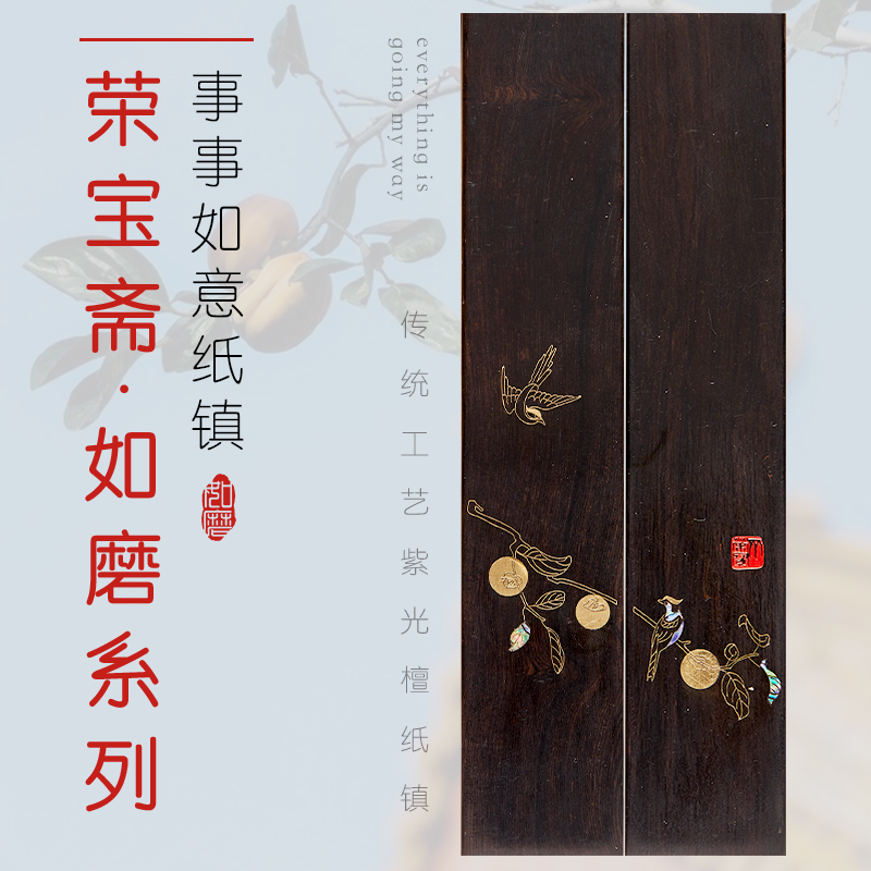 源自古法的手工工艺,掐丝与螺钿,镇尺与书签均有包装盒,送礼与自用很合适,系列产品嵌有翠鸟与柿子,寓意事事如意,整体紫光檀实木所制,小巧表面光滑是不伤纸,传统铜丝镶嵌加以螺钿工艺,给书房带来新鲜感。