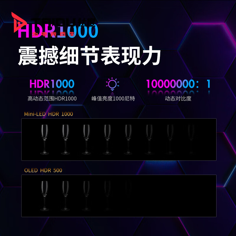 钛度此款 M27NQF-SE 显示屏,采用VA液晶面板,2K分辨率,165Hz刷新,1ms(MPRT)急速响应时间,支持AMD Adaptive-Sync同步技术。能够覆盖100%sRGB、95%DCI-P3、95%Adobe RGB色域。采用MiniLED背光技术,2304颗微米级别灯珠,384独立调光分区,SDR下峰值亮度可达800nits,HDR下峰值亮度可达1000nits。支持硬件级地蓝光,采用超高频PAM调光,呵护用眼健康。接口方面,提供HDMI2.0、DP1.4、3.5mm耳机孔。金属底座,可快速拆卸,支持VESA壁挂 75*75mm。