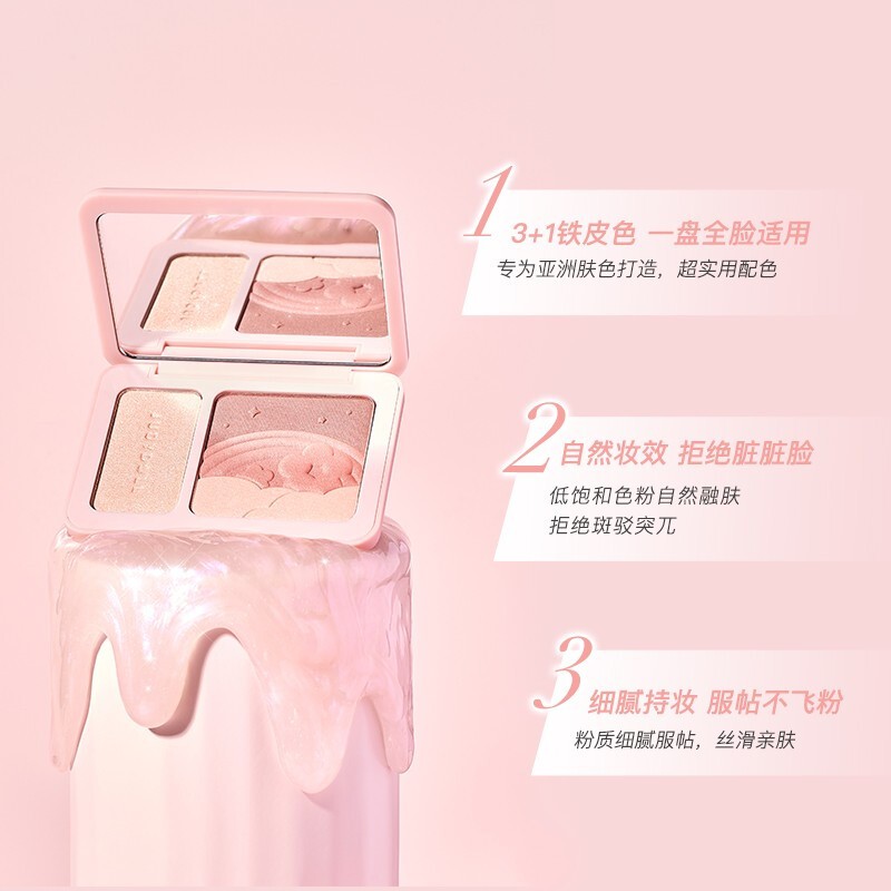 这款立体塑颜高光修容腮红盘,3+1的组合形式,一盘多用,性价比超高。修容+高光;腮红+高光。无论是修容或高光,腮红,饱和度都在偏温和的范围,显色适中,压盘实在不飞粉。粉质相对细腻,好晕染。新手入门也不难,重点价格也亲民,综合实力来看,挺优秀。