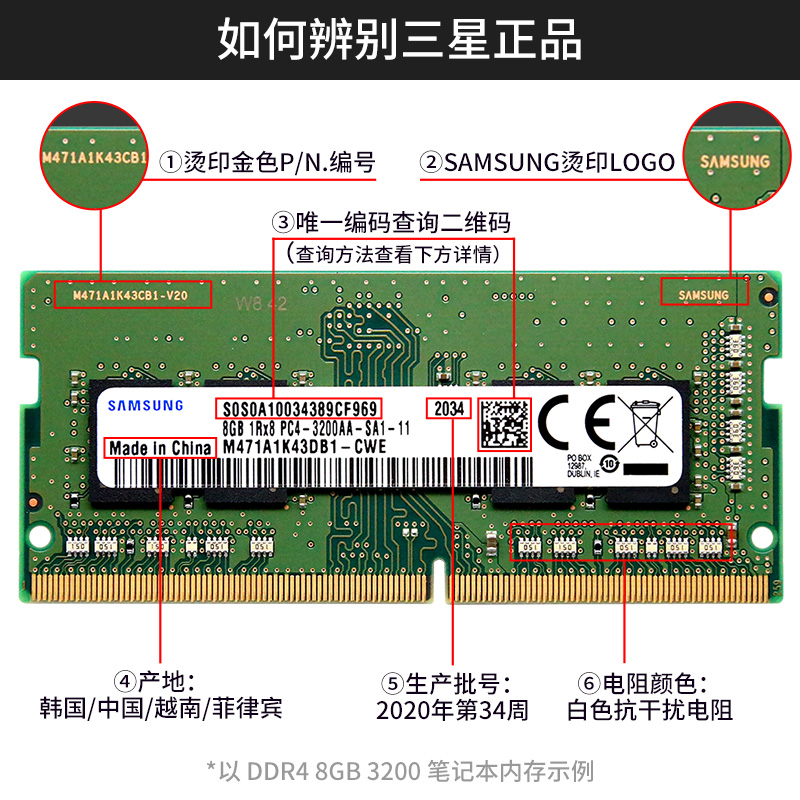 采用三星原厂DRAM芯片,DDR4模块,3200MHz频率,1.2V工作电压,8GB容量,3年质保。三星内存条,采用三星颗粒,适合笔记本升级选用。