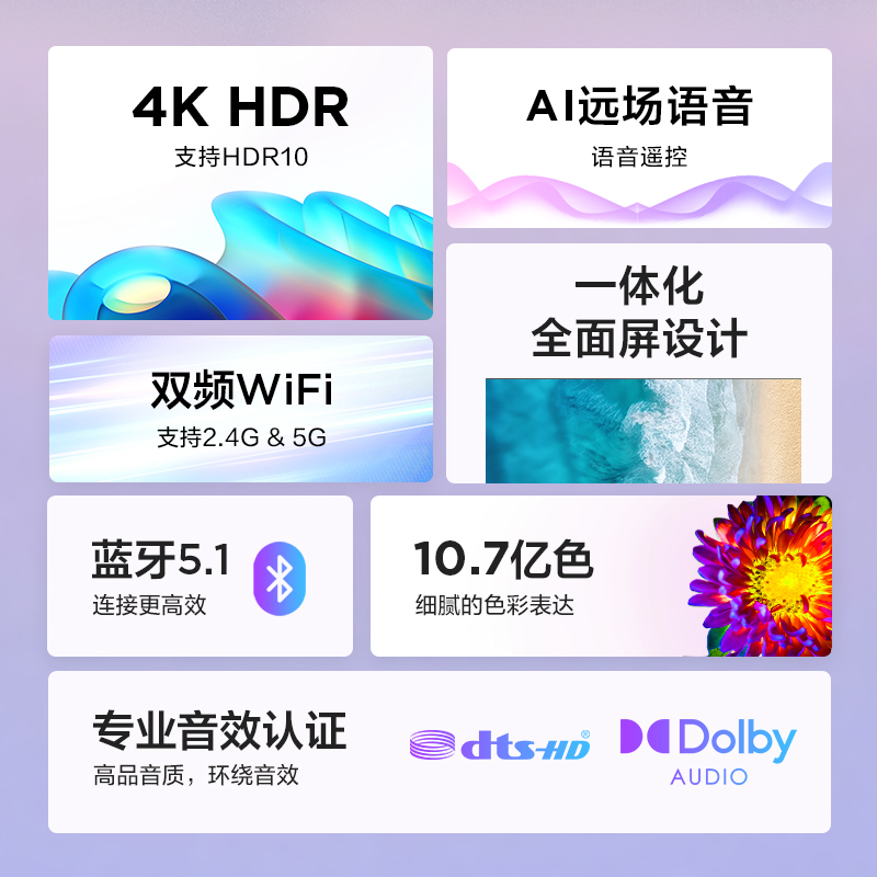 A远场语音,语音遥控。一体化全面屏设计。支持蓝牙5.1 连接更高效。