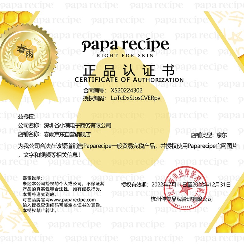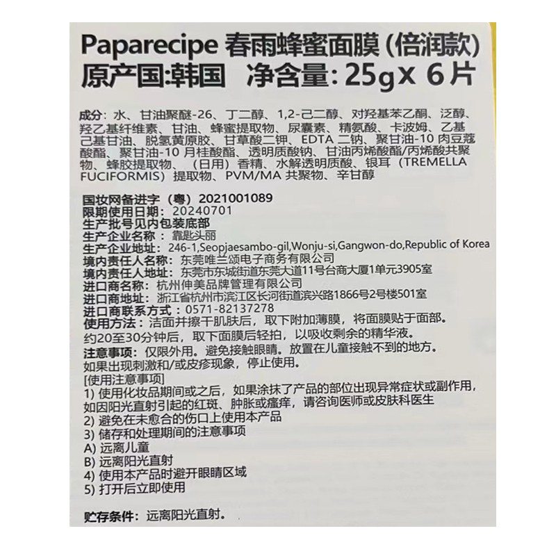 Papa recipe品牌主旨100%零添加,不含防腐剂不含铅汞和任何对人体有害化学物质。面膜精华中87%都是蜂蜜原液,适合任何类型皮肤。这款面膜内含大量蜂胶和蜂蜜,补水补湿功效,清爽不粘稠,此款春雨蜜罐面膜是Papa recipe家的王牌产品,面膜虽是蜂蜜成分但是却一点都不腻,打开包装会闻到淡淡的蜂蜜清香,这款敷完脸会滑滑的。