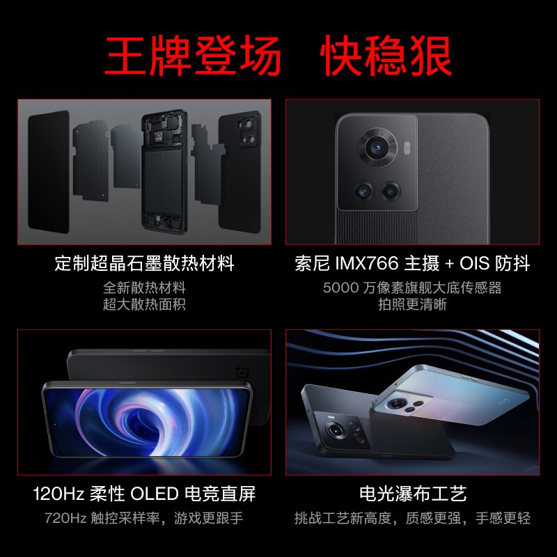 配置方面,处理器使用一加联合联发科深度定制、深度调校的天玑8100-MAX芯片,在完全拥有天玑8100所有特性的基础上,进一步对游戏帧率稳定性、AI算力和夜景视频降噪能力三个方面进行了大幅提升,辅以LPDDR5与UFS3.1闪存,配合HyperBoost游戏稳帧引擎与游戏独显芯片,带来出色的游戏体验,同时散热采用行业首创超晶石墨散热材料,VC散热面积到4129.8mm2,总散热面积可达35198.2mm2,还搭载了全新设计的电竞 9 天线+全球首发 Wi-Fi /蓝牙全加速技术,性能狠,游戏更稳。凭借一加Ace优异的游戏性能表现,获得了泰尔实验室的游戏手机认证、首届英雄联盟手游职业联赛比赛用机硬件测试认证以及和平精英职业联赛技术实验室赛事环境认证。