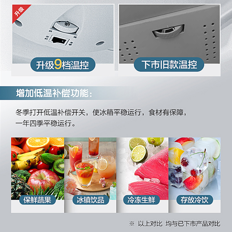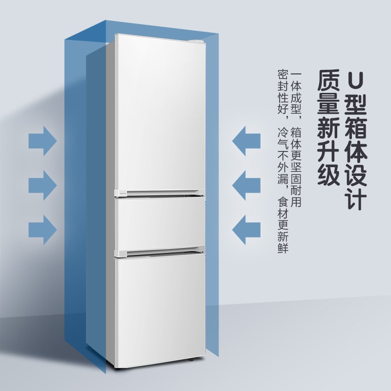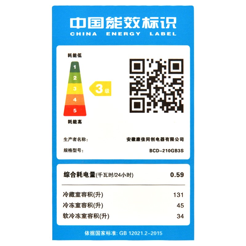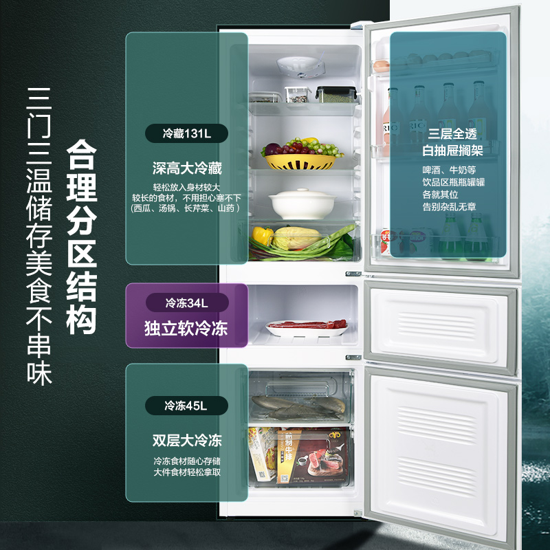 康佳(KONKA)这款型号为BCD-210GB3S的三门冰箱采用定频压缩机,制冷方式为直冷,总容积为210L,其中冷藏室131L、软冷冻室34L、冷冻室45L,横向加深设计,可以更好利用空间,支持9档温控,满足不同食材温度需求,日耗电量为0.59度。