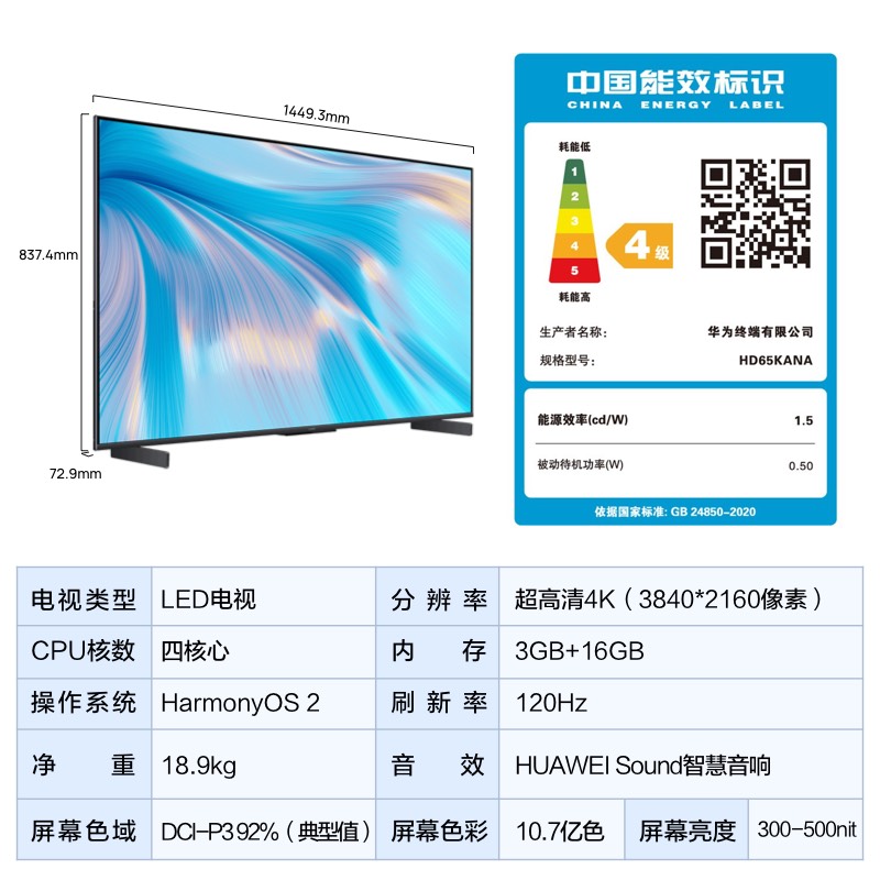 华为 智慧屏S系列 HD65KANA采用三面视觉无边,高屏占比全面屏设计。绮光绚彩显示技术,提供92%的DCI-P3色域。支持最高4K 120Hz刷新率,鸿鹄画质引擎四大技术加持,可以针对低帧率片源智能插帧,流畅无残影。其屏幕还获得了德国莱茵TÜV低蓝光和无频闪双重护眼认证。自研鸿鹄818芯片采用28nm工艺,2*A73+2*A53的4核CPU架构和4*G51的GPU架构,轻松播放8K电影。搭载4x10W大功率扬声器,配备1L大音腔,拥有专利高频扬声器,高音/人声增强8dB。此外,还支持虚拟声场扩展专利技术,突破物理限制,扩宽音频声场。