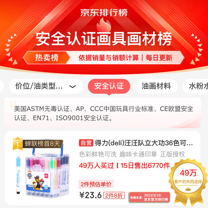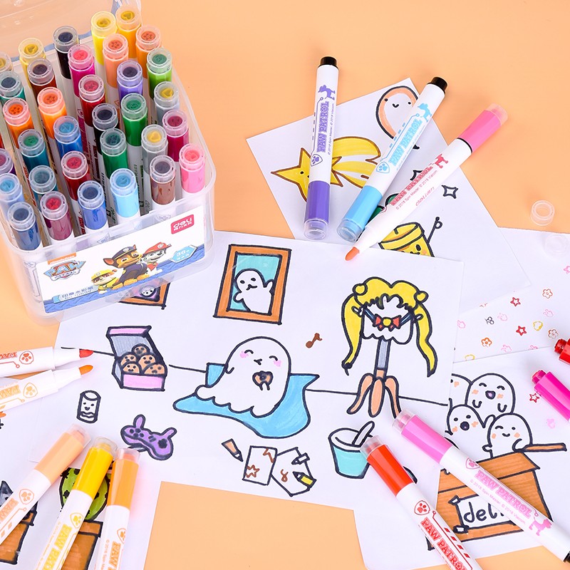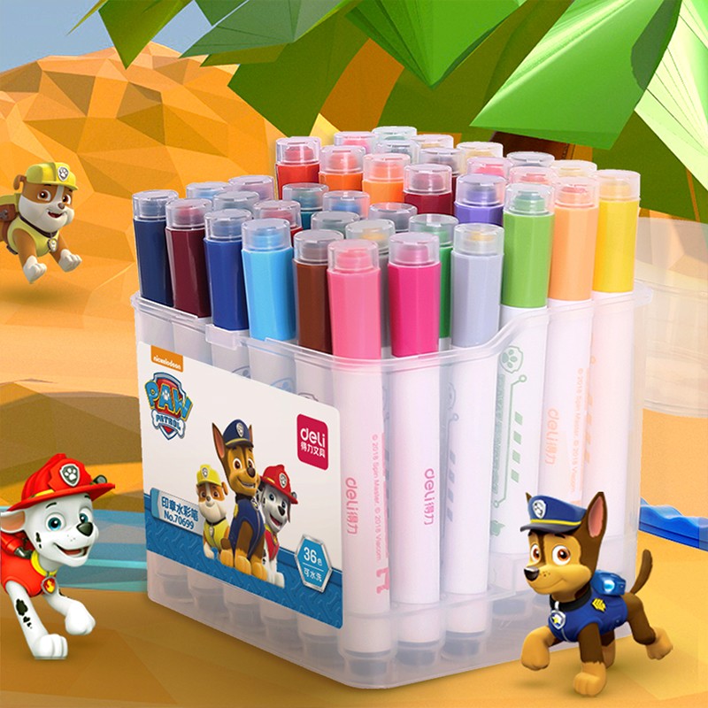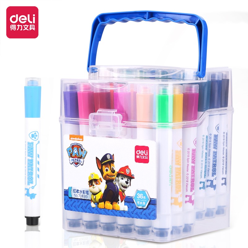 这款水彩笔为得力出品,采用大容量笔棉和可水洗墨水,笔帽带有小印章,可单独使用。此款为36色六角笔杆,带手提收纳箱,适合送给孩子作为绘画入门使用。