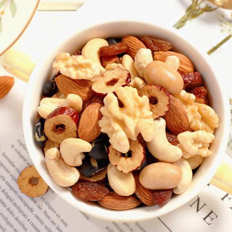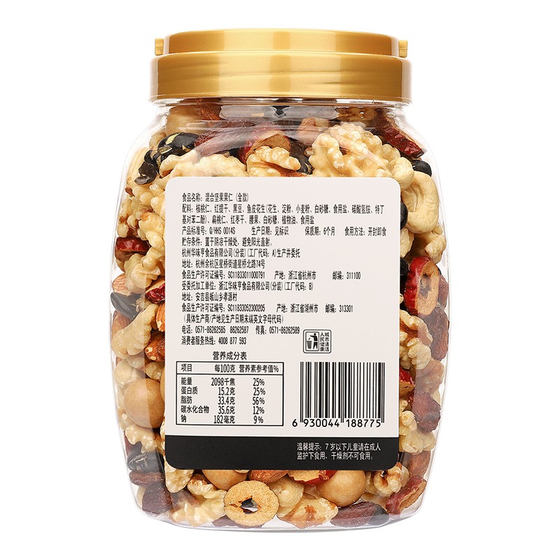华味亨的这款混合坚果果仁,内含腰果仁、巴旦木仁、核桃仁、鱼皮花生、香酥黑豆5种坚果和红提干、切片枣干2种果脯。均采用低温烘焙的方式,保留原本风味。坚果口感酥脆,果干温润自然。罐装包装,密封性好,即开即食。保质期6个月,建议置于阴凉干燥处储存。