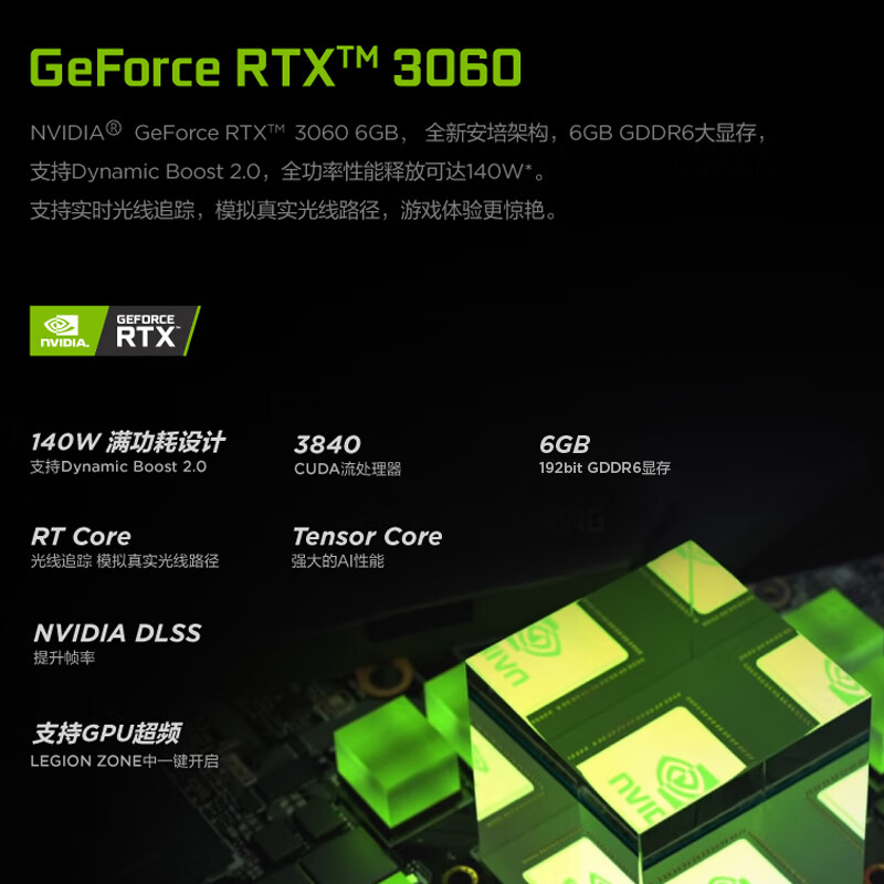 配置方面,处理器采用第12代 i9-12900H 处理器,全新intel 7工艺,十四核心二十线程,理论单核容频可达5.0GHz,野兽模式性能释放可达105W。搭载RTX3060显卡,拥有3840 CUDA流处理器,6GB 192bit GDDR6显存,可达140W性能释放,支持LEGION ZONE一键GPU超频。配置16GB DDR5双通道内存和512GB PCIe 4.0*4固态硬盘,预留 M.2 插槽,配置散热铠甲。散热采用霜刃散热系统 4.0,内置涡轮增压风扇,拥有2*10mm+1*8mm+2*6mm高性能复合式热管。