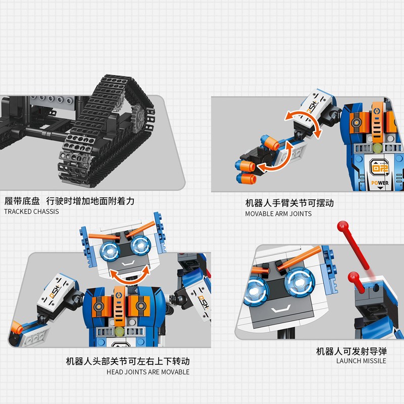 履带式底盘,轻质高强度材料,抓地力强。支持多种操控模式,可APP操控也可遥控操控,遥控距离30m。集成主控,运功电机,大扭矩,高转速,长久续航。手机智能编程控制,帮助孩子循序掌握编程技巧,不断深入学习成长,体验编程乐趣。同时具备蓝牙连接、单手操控、语音识别、远程遥控,可发射子弹等。