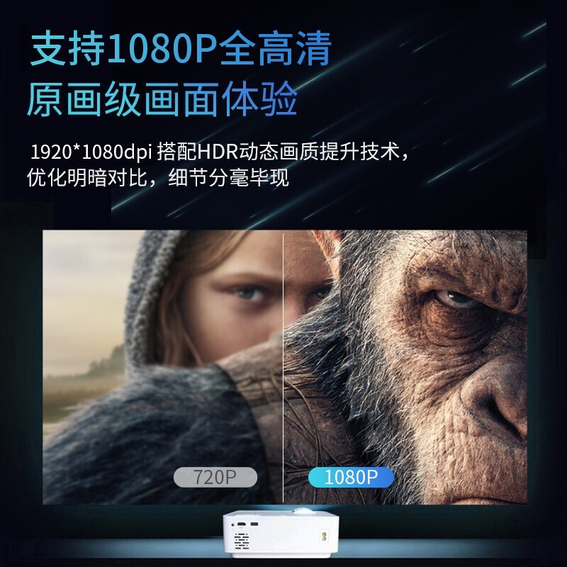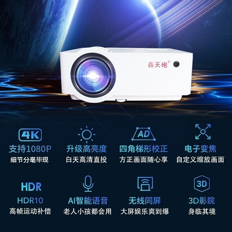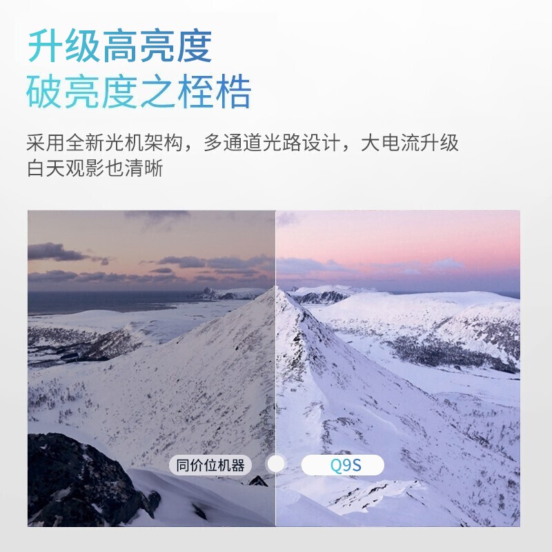 轰天炮 Q9S 4K智能投影机是轰天炮在2021年推出的旗舰款产品,这款产品采用单片式LCD显示技术,标准分辨率为1280×720,最高可以支持4K解码技术。该机采用LED光源,光源的亮度为5000流明,对比度声称达到了50000:1. 在智能应用方面,轰天炮 Q9S 4K智能投影机内置安卓智能操作系统,拥有海量视频资源。下载APP可以观看电影、电视剧、综艺、儿童动画片等海量影院资源。另外,轰天炮 Q9S 4K智能投影仪支持自动对焦,1S变清晰。支持四向40度自动梯形矫正。 此外,这款投影机支持HDR10功能,画面层次感更加强烈。音效支持杜比以及DTS解码。同时,无线投屏,AI语音控制等智能功能应有尽有。该机的电子无极缩放功能,在短距离内都能投出百寸大屏。 在接口方面,这款投影机支持连接多种设备,例如机顶盒、DVD、PC、笔记本电脑、游戏机等。机身内置高品质双立体声环绕音响,视听一体享受,不用外接音响也可以看电影。