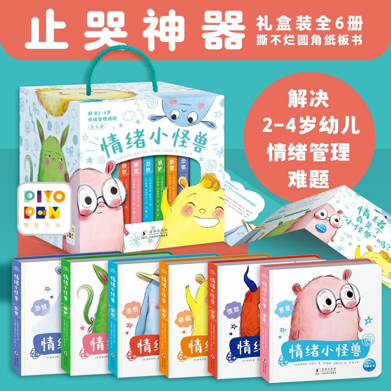《情绪小怪兽》礼盒装共6册,含:骄傲、愤怒、悲伤、害羞、嫉妒、恐惧;绘本内容引导孩子接纳情绪,完善自我认知,更好的帮助孩子表达情绪,促进性格养成,能够陪伴孩子正确处理情绪,培养解决问题的能力。同时全套采用了撕不烂的圆角纸板书,宝宝阅读更放心。