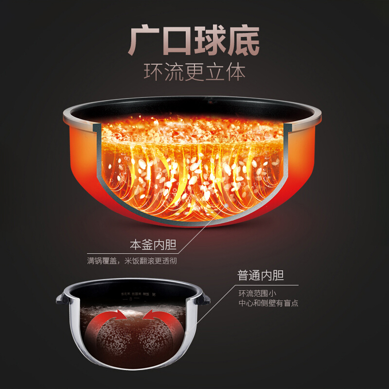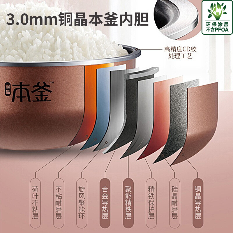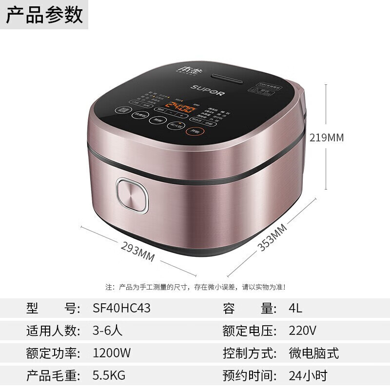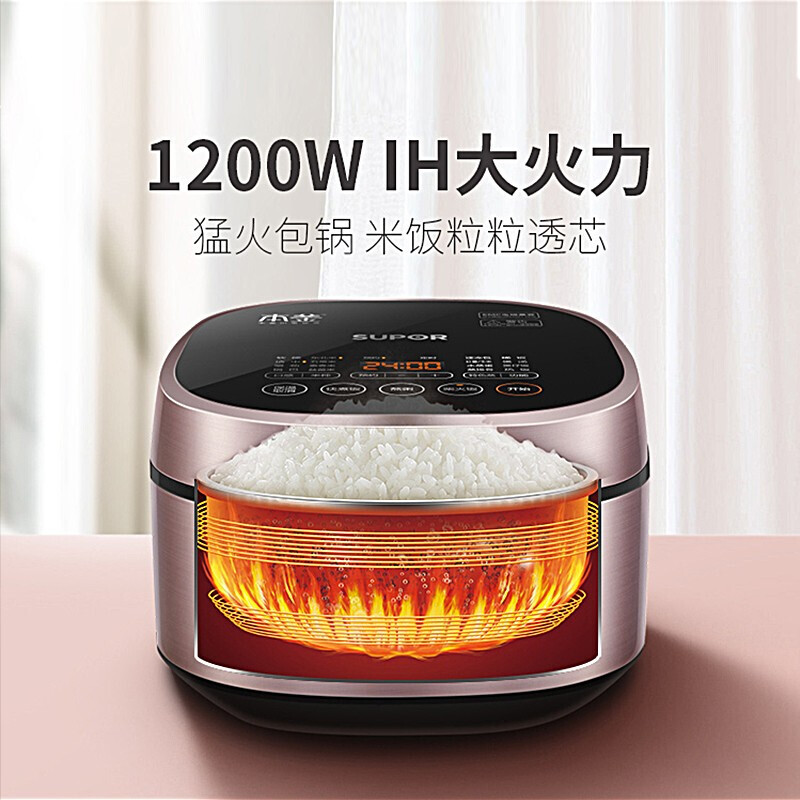 苏泊尔(SUPOR)这款型号为SF40HC43的电饭煲,配备4升容量的聚能本釜内胆,保证均匀受热。加热方式采用了流行的IH电磁加热,拥有1200W大火力,猛火包锅,米饭粒粒透芯。上盖同步加热,有效减少冷凝水,全面屏触控操作,简单直观方便。人性化的采用了304不锈钢可拆内盖,方便清洗。