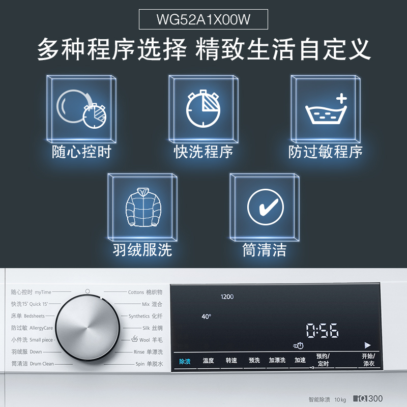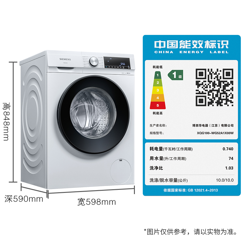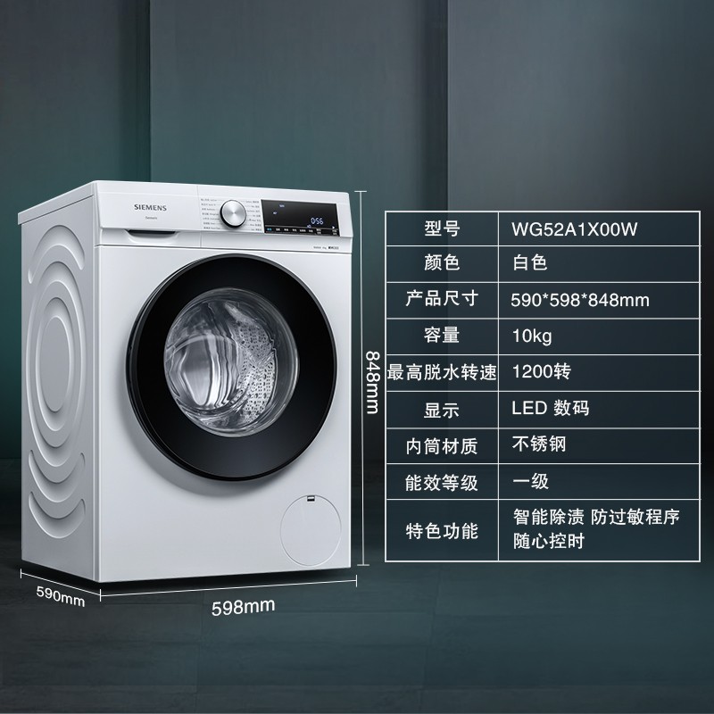 这款SIEMENS 西门子 XQG100-WG52A1X00W 变频滚筒洗衣机,配备10KG大容量,BLDC变频电机,iSensoric智能洗涤,自由选择20-60分钟5档洗涤时间,生活节奏灵活掌控,随心控时。1200转强劲动力,以劲制动成就出众洗涤表现。480mm双层大视窗,大观净界一目了然。产品尺寸:848×598×590(MM)