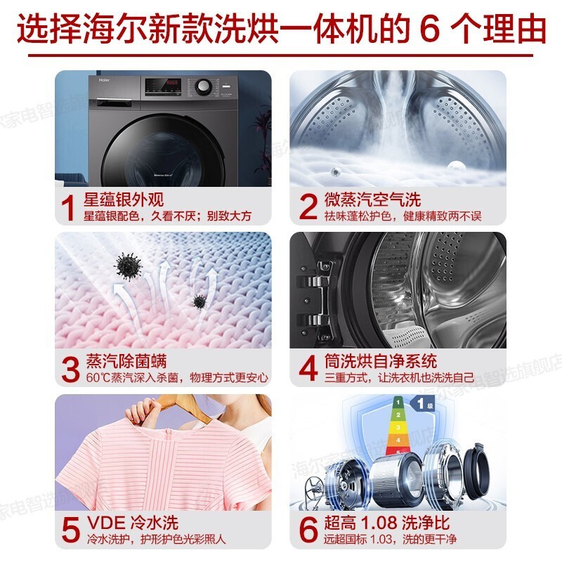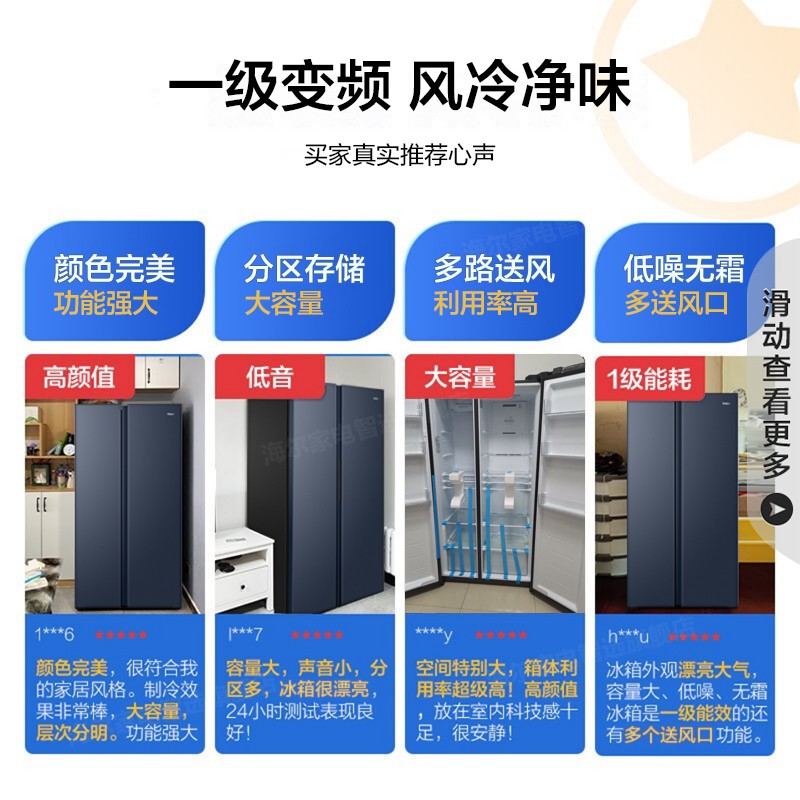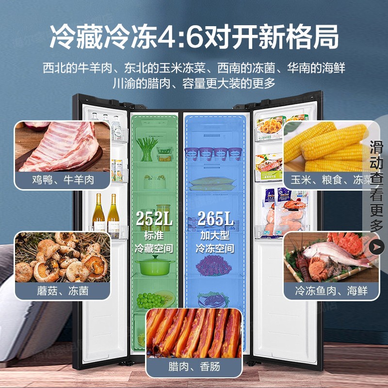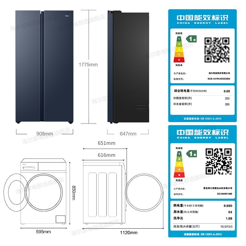 Haier海尔BCD-517WLHSSEDB9双变频冰箱是22年最新上市的一级双变频大容积冰箱,一级双变频:变频压缩机+变频风机,一天不到一度电,制冷更快、节能静音; 分层多路送风:采用精控传感器,配合冷藏、冷冻多出风口,温度均匀,波动性小;黑金净化:有效吸附清洁冰箱内的气味,全面呵护食材健康、守护食材原鲜口感; 风冷无霜:采用风冷控制系统,免除除霜烦恼; 90°开门悬停:门体打开至90°,抽屉可无障碍抽取,门体可自动悬停,释放双手; 265L大冷冻:打破常规储鲜,远超常规冷柜,相当于为家再添一个小冷柜; 舒心品质:柔和光线不刺眼,人体工学把手更开合省力等等小细节。 洗烘一体洗衣机:杀菌去异味,温软护衣,烘干黑科技,面面俱到。65-85摄氏度变温烘干,16M/S热状态均匀风速及时烘干。NTC智能传感器,精准控温,1秒测温100次。JIT衣干即停,防止过度烘干。采用60摄氏度蒸汽深入纤维杀灭细菌,物理方式更安心。BLDC变频电机,平稳运行不扰眠。中途添衣,漏洗衣物虽然添加。双喷淋,随漂随冲,泡沫少残留。AMT抗菌窗垫,抗菌率>99%防菌抗霉。