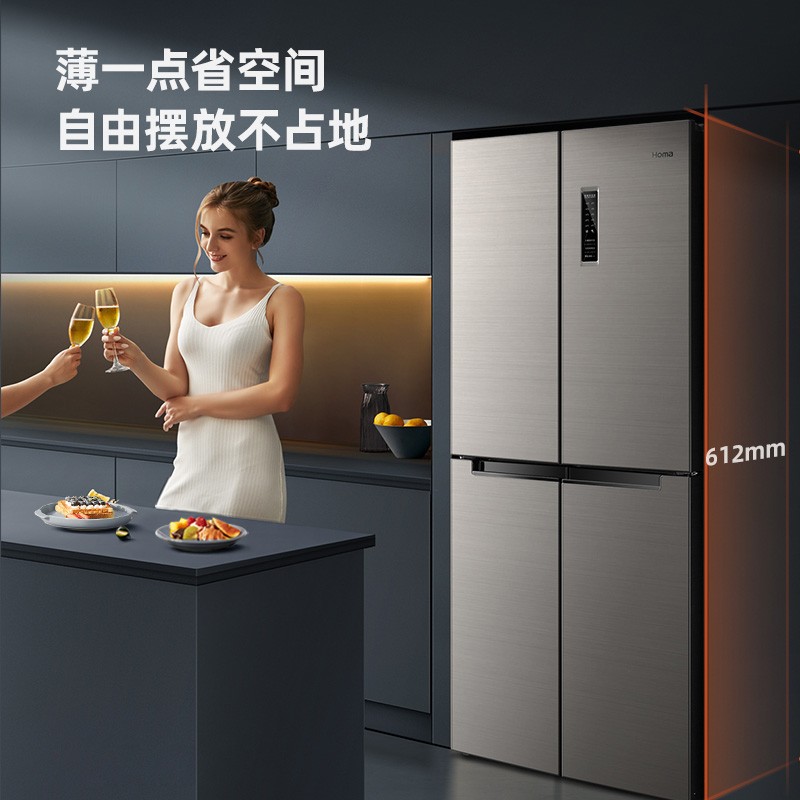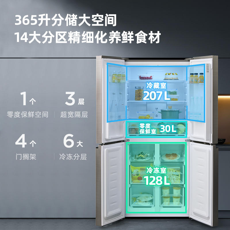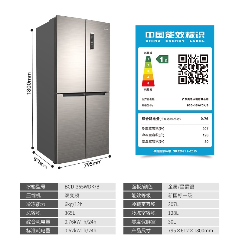 这款奥马多门冰箱,365L大容量,smart双变频技术,冰箱运行更静音、更节能,1天低至0.76度电,达到国家一级能效标准,大冰箱也省电。38分贝静音运行。530mm薄机身,轻松融入橱柜,更省空间。大气十字四门存储结构,将冰箱内冷冻冷藏空间合理分区,保鲜不串味,满足全家储鲜需求。独立0℃保鲜舱,呵护食材原味,保鲜效果更佳。